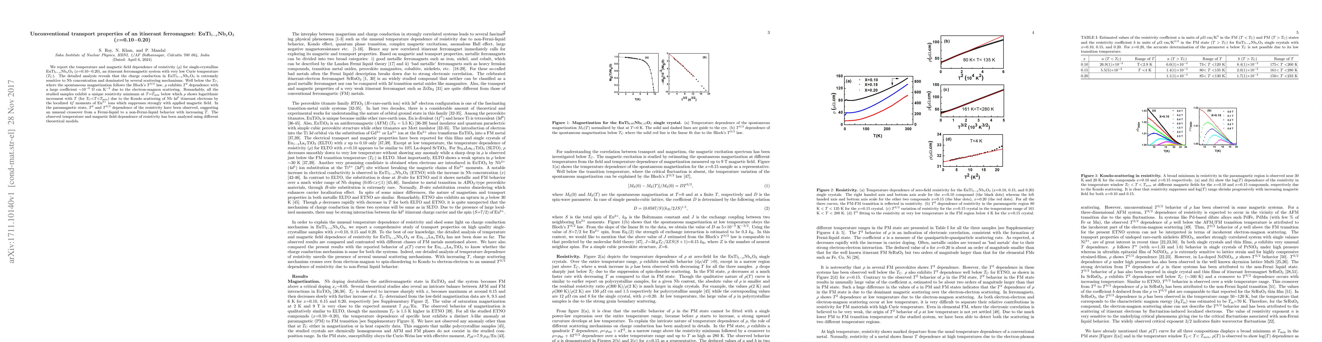 We report the temperature and magnetic field dependence of resistivity ($\rho$) for single-crystalline EuTi$_{1-x}$Nb$_{x}$O$_3$ ($x$=0.10$-$0.20), an itinerant ferromagnetic system with very low Curie temperature ($T_C$). The detailed analysis reveals that the charge conduction in EuTi$_{1-x}$Nb$_{x}$O$_3$ is extremely sensitive to Nb concentration and dominated by several scattering mechanisms. Well below the $T_C$, where the spontaneous magnetization follows the Bloch's $T^{3/2}$ law, $\rho$ exhibits $T^2$ dependence with a large coefficient $\sim$10$^{-8}$ $\Omega$ cm K$^{-2}$ due to the electron-magnon scattering. Remarkably, all the studied samples exhibit a unique resistivity minimum at $T$$=$$T_{\rm min}$ below which $\rho$ shows logarithmic increment with $T$ (for $T_{\rm C}$$<$$T$$<$$T_{\rm min}$) due to the Kondo scattering of Nb 4$d^1$ itinerant electrons by the localized 4$f$ moments of Eu$^{2+}$ ions which suppresses strongly with applied magnetic field. In the paramagnetic state, $T^{2}$ and $T^{3/2}$ dependence of the resistivity have been observed, suggesting an unusual crossover from a Fermi-liquid to a non-Fermi-liquid behavior with increasing $T$. The observed temperature and magnetic field dependence of resistivity has been analysed using different theoretical models.
