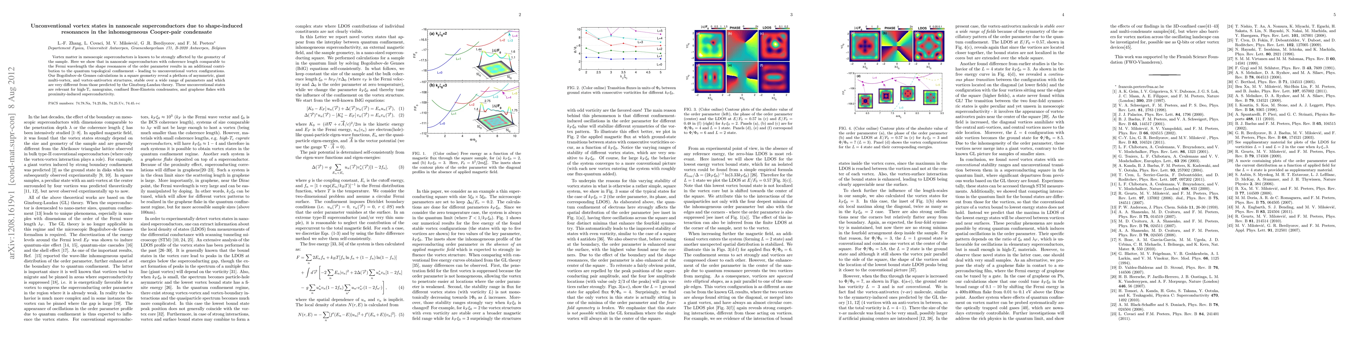 Vortex matter in mesoscopic superconductors is known to be strongly affected by the geometry of the sample. Here we show that in nanoscale superconductors with coherence length comparable to the Fermi wavelength the shape resonances of the order parameter results in an additional contribution to the quantum topological confinement - leading to unconventional vortex configurations. Our Bogoliubov-de Gennes calculations in a square geometry reveal a plethora of asymmetric, giant multi-vortex, and vortex-antivortex structures, stable over a wide range of parameters and which are very different from those predicted by the Ginzburg-Landau theory. These unconventional states are relevant for high-Tc nanograins, confined Bose-Einstein condensates, and graphene flakes with proximity-induced superconductivity.