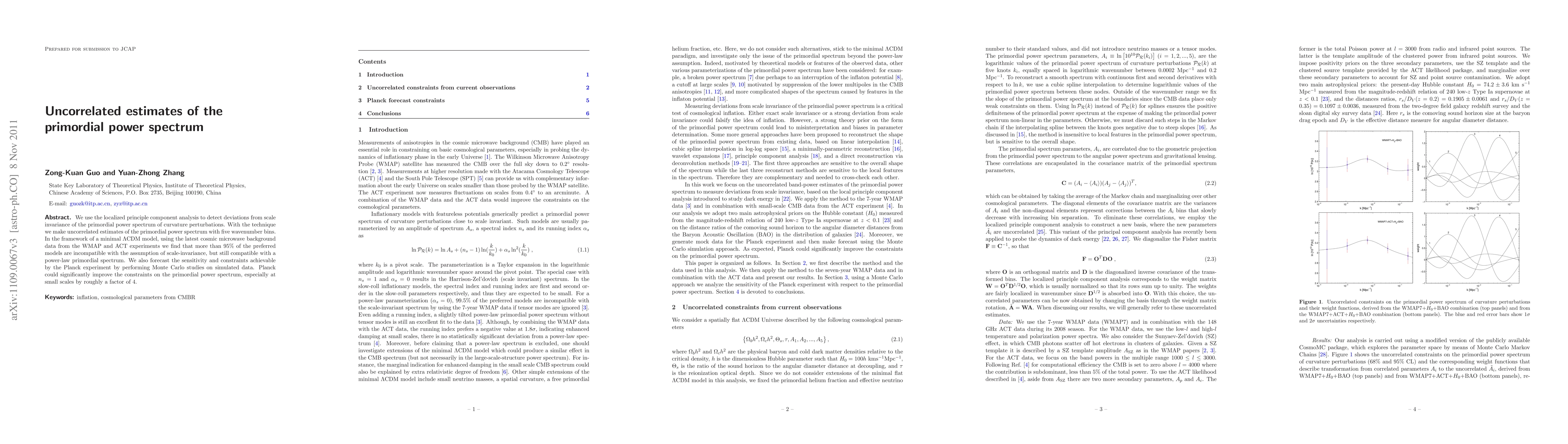 We use the localized principle component analysis to detect deviations from scale invariance of the primordial power spectrum of curvature perturbations. With the technique we make uncorrelated estimates of the primordial power spectrum with five wavenumber bins. In the framework of a minimal LCDM model, using the latest cosmic microwave background data from the WMAP and ACT experiments we find that more than 95% of the preferred models are incompatible with the assumption of scale-invariance, but still compatible with a power-law primordial spectrum. We also forecast the sensitivity and constraints achievable by the Planck experiment by performing Monte Carlo studies on simulated data. Planck could significantly improve the constraints on the primordial power spectrum, especially at small scales by roughly a factor of 4.