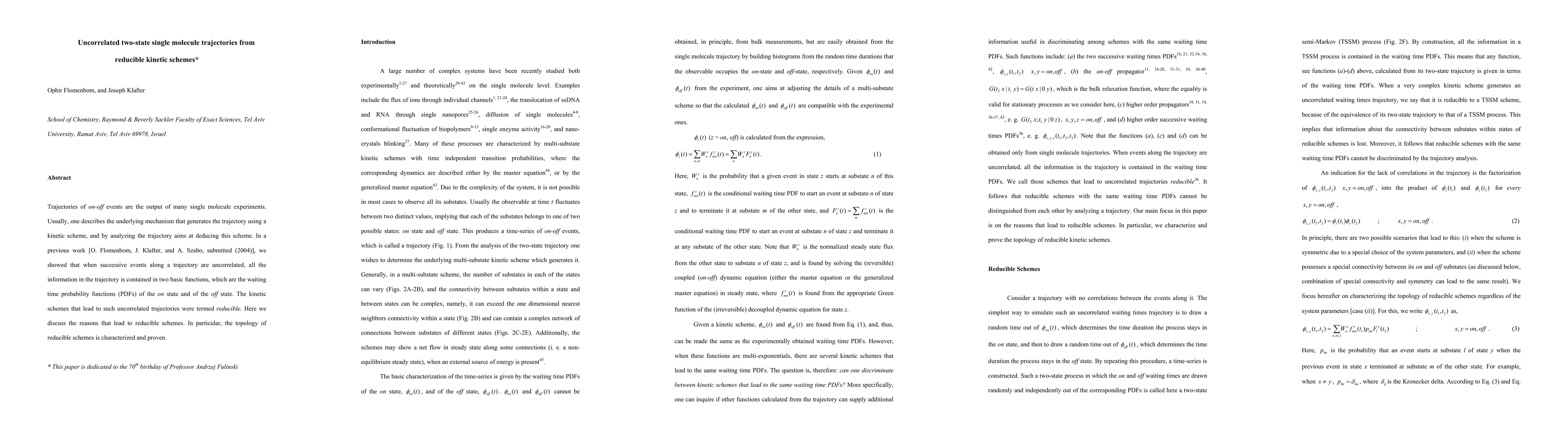Single molecule trajectories can reveal underlying kinetic schemes through analyzing on-off events. Researchers identified a specific type of scheme called reducible, characterized by uncorrelated events that contain all trajectory information in two basic functions.