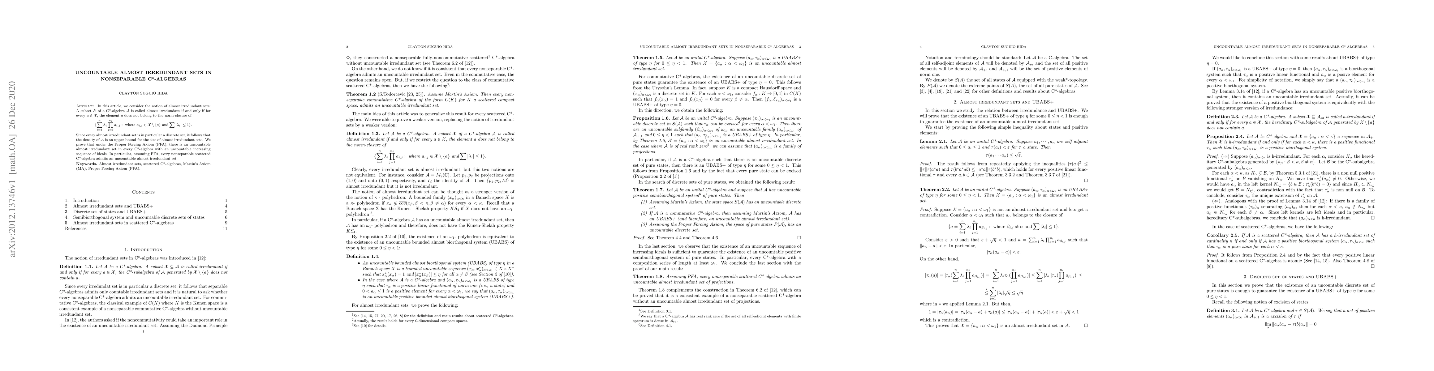 This paper explores the existence of uncountable almost irredundant sets in nonseparable C*-algebras, proving that under the Proper Forcing Axiom (PFA), such sets exist in C*-algebras with uncountable increasing sequences of ideals, particularly in nonseparable scattered C*-algebras.
