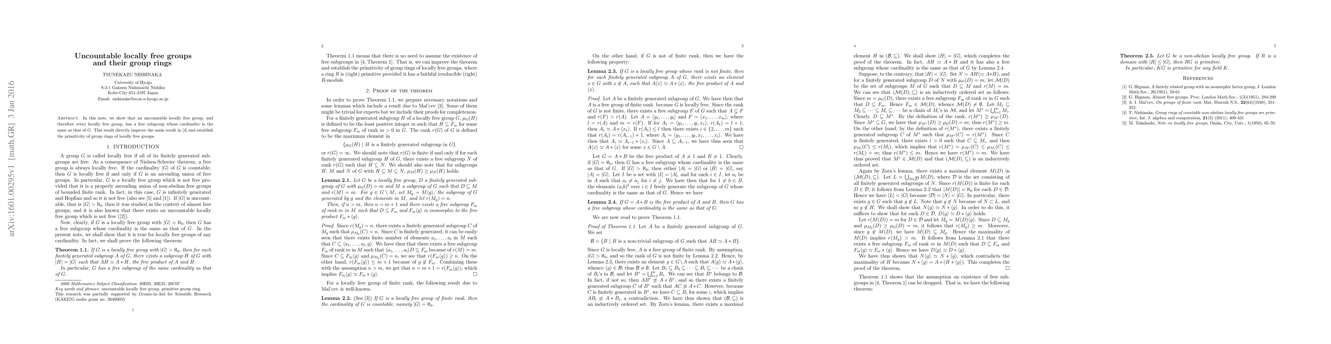 Summary: This paper demonstrates that any uncountable locally free group contains a free subgroup of the same cardinality, improving upon a previous result and establishing the primitivity of group rings for such groups.