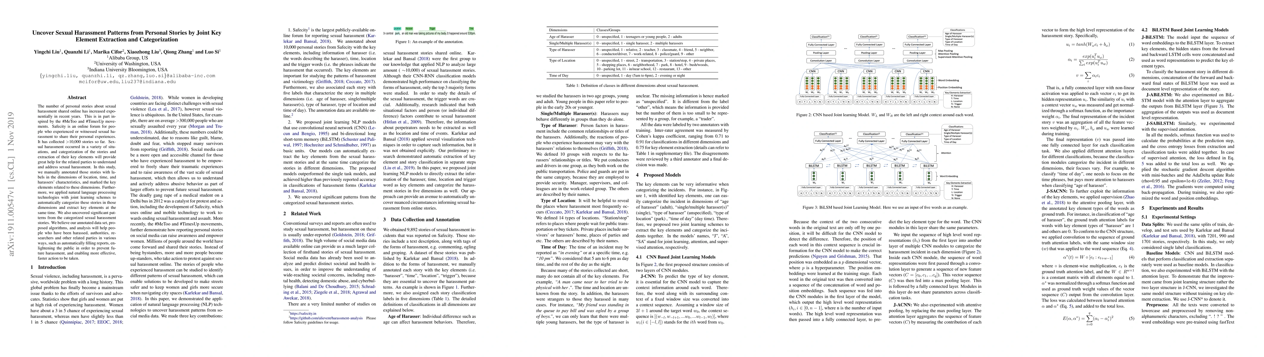 The number of personal stories about sexual harassment shared online has increased exponentially in recent years. This is in part inspired by the \#MeToo and \#TimesUp movements. Safecity is an online forum for people who experienced or witnessed sexual harassment to share their personal experiences. It has collected \textgreater 10,000 stories so far. Sexual harassment occurred in a variety of situations, and categorization of the stories and extraction of their key elements will provide great help for the related parties to understand and address sexual harassment. In this study, we manually annotated those stories with labels in the dimensions of location, time, and harassers' characteristics, and marked the key elements related to these dimensions. Furthermore, we applied natural language processing technologies with joint learning schemes to automatically categorize these stories in those dimensions and extract key elements at the same time. We also uncovered significant patterns from the categorized sexual harassment stories. We believe our annotated data set, proposed algorithms, and analysis will help people who have been harassed, authorities, researchers and other related parties in various ways, such as automatically filling reports, enlightening the public in order to prevent future harassment, and enabling more effective, faster action to be taken.