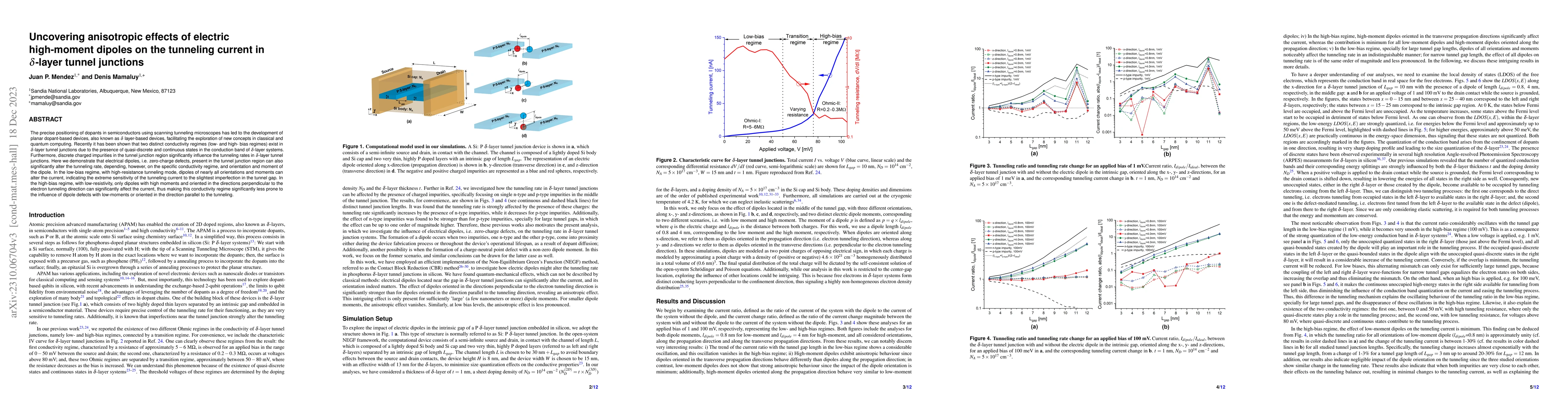 This paper investigates how electric dipoles in the tunnel junction region affect tunneling current in $\delta$-layer tunnel junctions, revealing anisotropic effects based on the dipole's orientation and moment. In low-bias regimes, nearly all dipole orientations and moments can alter the current, while in high-bias regimes, only high-moment dipoles oriented perpendicular to the electron tunneling direction significantly impact the current.