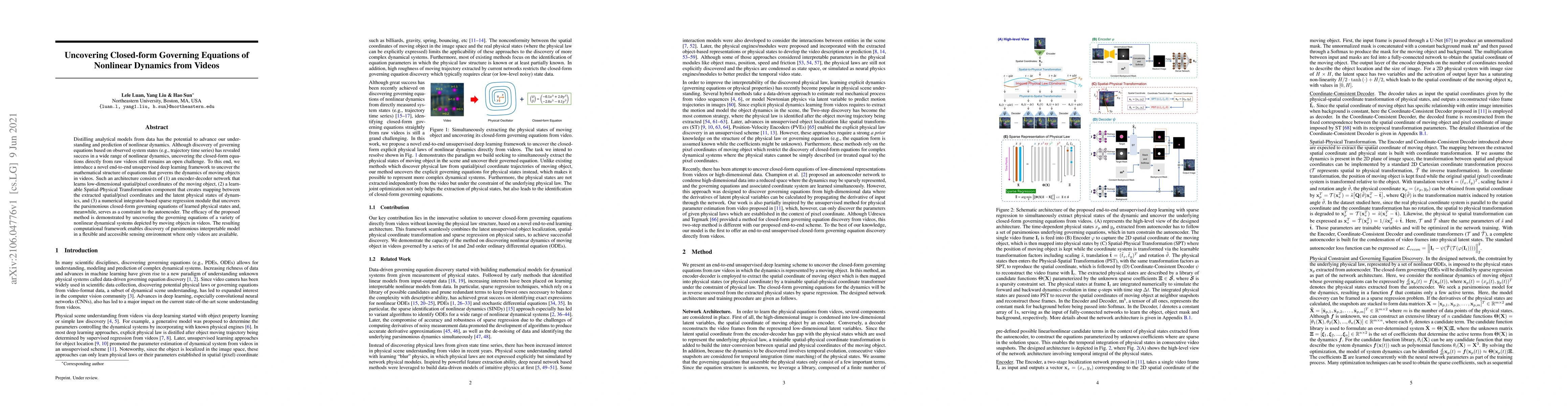 This paper introduces a novel unsupervised deep learning framework to extract closed-form governing equations from raw videos of nonlinear dynamical systems. The framework combines an encoder-decoder network, a Spatial-Physical Transformation component, and a sparse regression module to uncover the underlying mathematical structure of the dynamics.
