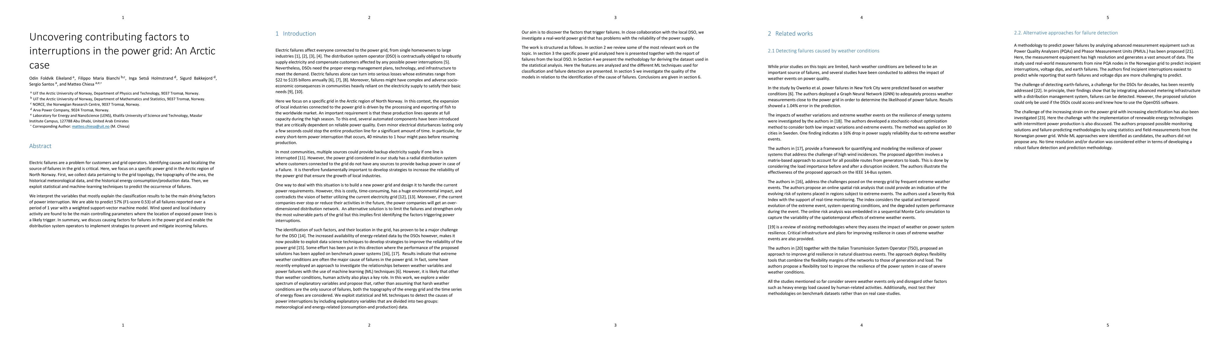 Electric failures are a problem for customers and grid operators. Identifying causes and localizing the source of failures in the grid is critical. Here, we focus on a specific power grid in the Arctic region of North Norway. First, we collect data pertaining to the grid topology, the topography of the area, the historical meteorological data, and the historical energy consumption/production data. Then, we exploit statistical and machine-learning techniques to predict the occurrence of failures. We interpret the variables that mostly explain the classification results to be the main driving factors of power interruption. We are able to predict 57% (F1-score 0.53) of all failures reported over a period of 1 year with a weighted support-vector machine model. Wind speed and local industry activity are found to be the main controlling parameters where the location of exposed power lines is a likely trigger. In summary, we discuss causing factors for failures in the power grid and enable the distribution system operators to implement strategies to prevent and mitigate incoming failures.
