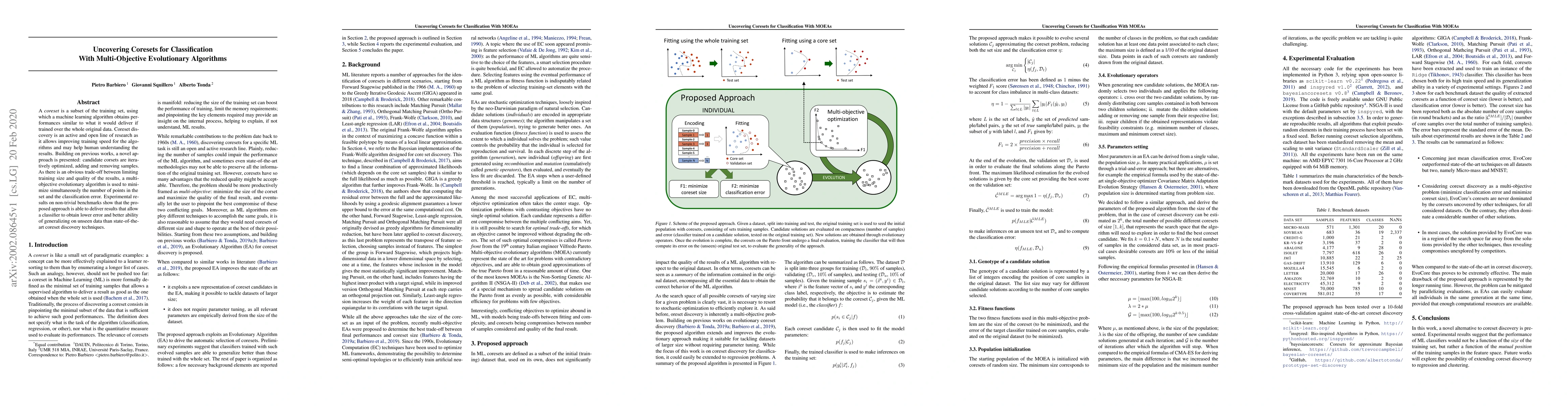 A coreset is a subset of the training set, using which a machine learning algorithm obtains performances similar to what it would deliver if trained over the whole original data. Coreset discovery is an active and open line of research as it allows improving training speed for the algorithms and may help human understanding the results. Building on previous works, a novel approach is presented: candidate corsets are iteratively optimized, adding and removing samples. As there is an obvious trade-off between limiting training size and quality of the results, a multi-objective evolutionary algorithm is used to minimize simultaneously the number of points in the set and the classification error. Experimental results on non-trivial benchmarks show that the proposed approach is able to deliver results that allow a classifier to obtain lower error and better ability of generalizing on unseen data than state-of-the-art coreset discovery techniques.