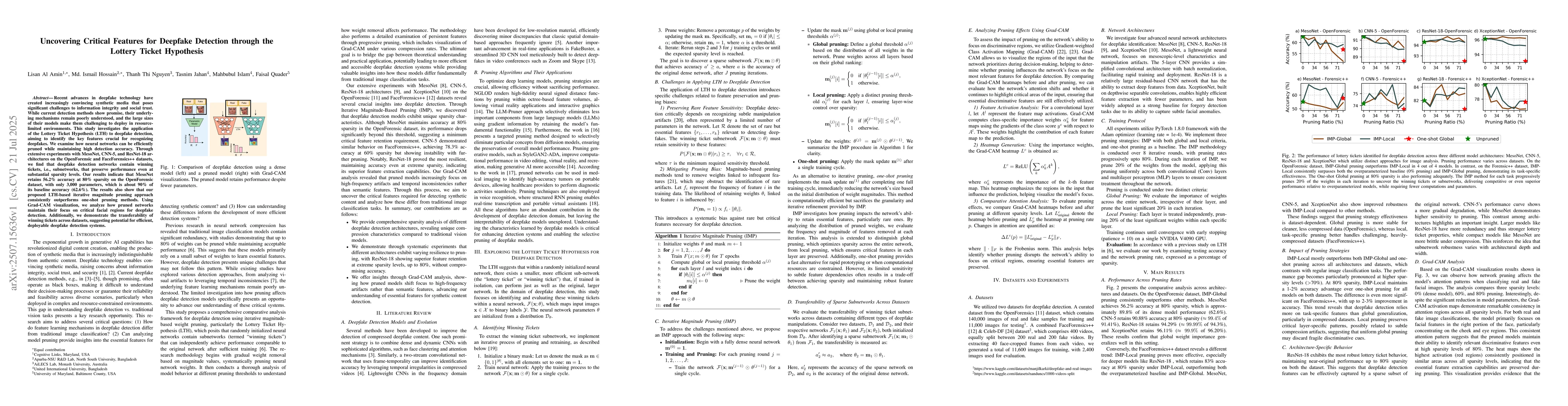 Recent advances in deepfake technology have created increasingly convincing synthetic media that poses significant challenges to information integrity and social trust. While current detection methods show promise, their underlying mechanisms remain poorly understood, and the large sizes of their models make them challenging to deploy in resource-limited environments. This study investigates the application of the Lottery Ticket Hypothesis (LTH) to deepfake detection, aiming to identify the key features crucial for recognizing deepfakes. We examine how neural networks can be efficiently pruned while maintaining high detection accuracy. Through extensive experiments with MesoNet, CNN-5, and ResNet-18 architectures on the OpenForensic and FaceForensics++ datasets, we find that deepfake detection networks contain winning tickets, i.e., subnetworks, that preserve performance even at substantial sparsity levels. Our results indicate that MesoNet retains 56.2% accuracy at 80% sparsity on the OpenForensic dataset, with only 3,000 parameters, which is about 90% of its baseline accuracy (62.6%). The results also show that our proposed LTH-based iterative magnitude pruning approach consistently outperforms one-shot pruning methods. Using Grad-CAM visualization, we analyze how pruned networks maintain their focus on critical facial regions for deepfake detection. Additionally, we demonstrate the transferability of winning tickets across datasets, suggesting potential for efficient, deployable deepfake detection systems.