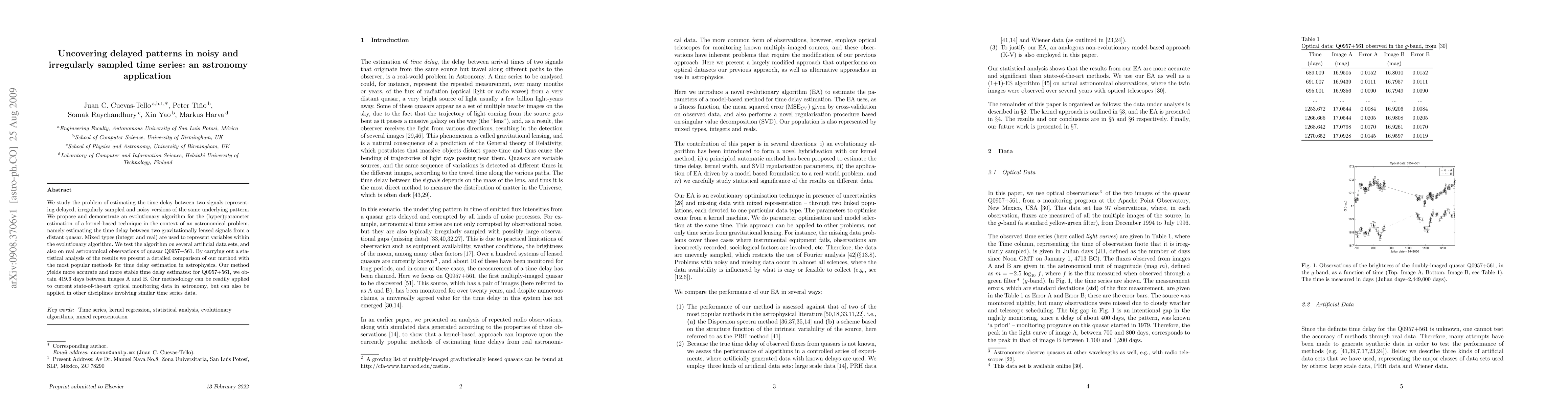 This paper proposes an evolutionary algorithm for estimating time delays between noisy, irregularly sampled signals, specifically applied to gravitationally lensed quasars. The method demonstrates improved accuracy and stability compared to existing techniques, achieving a time delay estimate of 419.6 days for quasar Q0957+561.