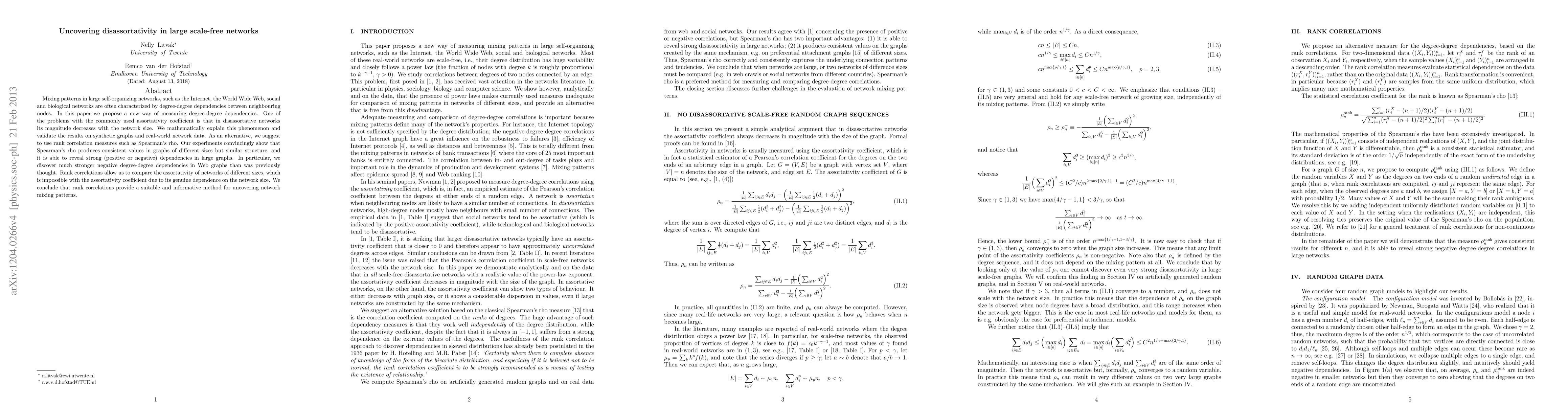 Mixing patterns in large self-organizing networks, such as the Internet, the World Wide Web, social and biological networks are often characterized by degree-degree dependencies between neighbouring nodes. In this paper we propose a new way of measuring degree-degree dependencies. One of the problems with the commonly used assortativity coefficient is that in disassortative networks its magnitude decreases with the network size. We mathematically explain this phenomenon and validate the results on synthetic graphs and real-world network data. As an alternative, we suggest to use rank correlation measures such as Spearman's rho. Our experiments convincingly show that Spearman's rho produces consistent values in graphs of different sizes but similar structure, and it is able to reveal strong (positive or negative) dependencies in large graphs. In particular, we discover much stronger negative degree-degree dependencies} in Web graphs than was previously thought. {Rank correlations allow us to compare the assortativity of networks of different sizes, which is impossible with the assortativity coefficient due to its genuine dependence on the network size. We conclude that rank correlations provide a suitable and informative method for uncovering network mixing patterns.