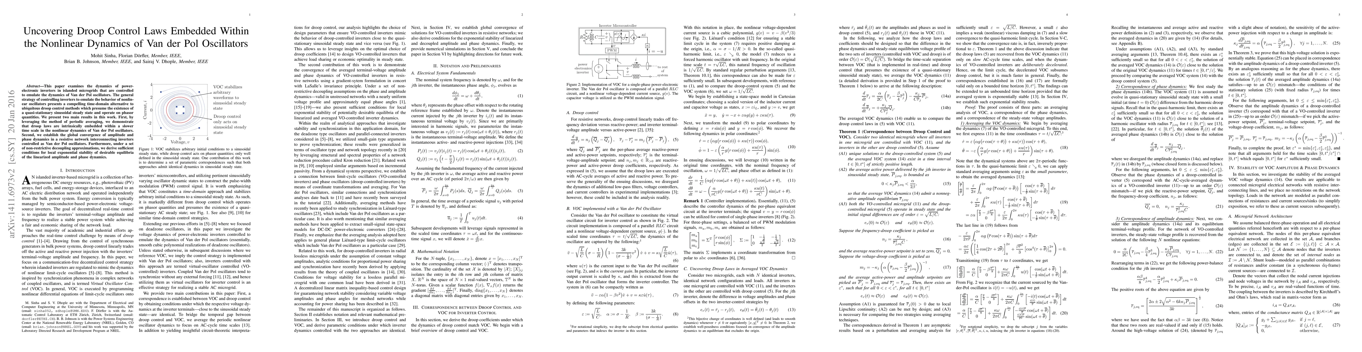 This paper examines the dynamics of power-electronic inverters in islanded microgrids that are controlled to emulate the dynamics of Van der Pol oscillators. The general strategy of controlling inverters to emulate the behavior of nonlinear oscillators presents a compelling time-domain alternative to ubiquitous droop control methods which presume the existence of a quasi-stationary sinusoidal steady state and operate on phasor quantities. We present two main results in this work. First, by leveraging the method of periodic averaging, we demonstrate that droop laws are intrinsically embedded within a slower time scale in the nonlinear dynamics of Van der Pol oscillators. Second, we establish the global convergence of amplitude and phase dynamics in a resistive network interconnecting inverters controlled as Van der Pol oscillators. Furthermore, under a set of non-restrictive decoupling approximations, we derive sufficient conditions for local exponential stability of desirable equilibria of the linearized amplitude and phase dynamics.