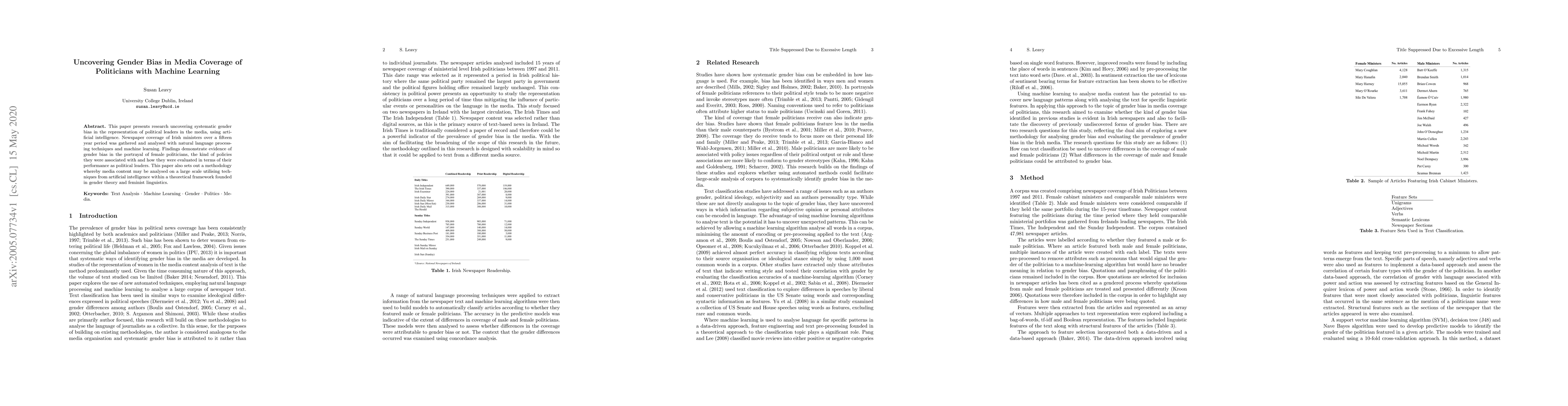 This paper uses machine learning to uncover systematic gender bias in the media coverage of Irish ministers over 15 years, revealing biased portrayals and evaluations of female politicians. It proposes a methodology for large-scale media analysis grounded in gender theory and feminist linguistics.
