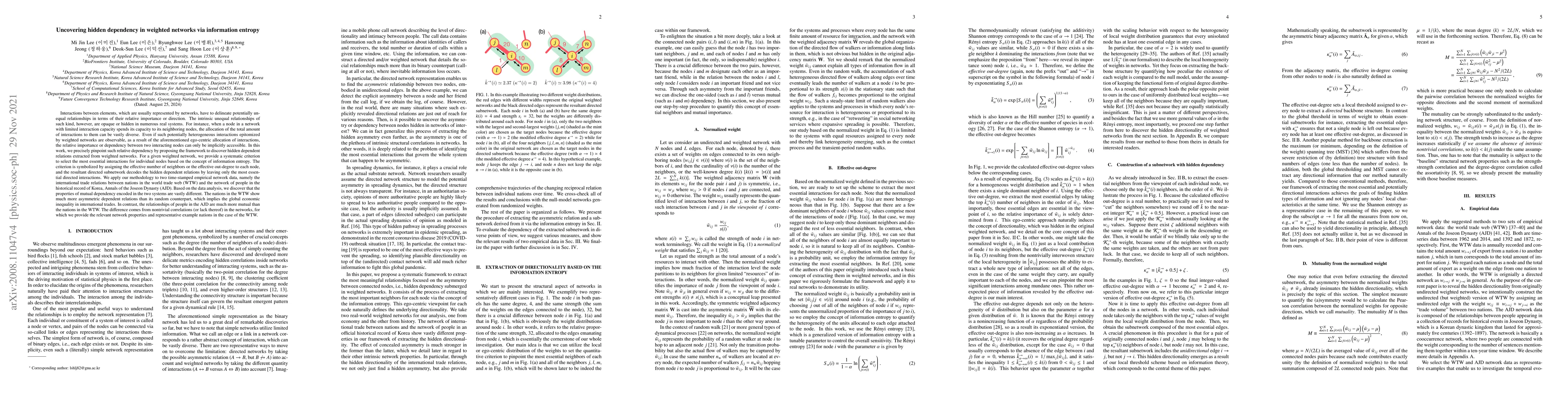 Interactions between elements, which are usually represented by networks, have to delineate potentially unequal relationships in terms of their relative importance or direction. The intrinsic unequal relationships of such kind, however, are opaque or hidden in numerous real systems. For instance, when a node in a network with limited interaction capacity spends its capacity to its neighboring nodes, the allocation of the total amount of interactions to them can be vastly diverse. Even if such potentially heterogeneous interactions epitomized by weighted networks are observable, as a result of the aforementioned ego-centric allocation of interactions, the relative importance or dependency between two interacting nodes can only be implicitly accessible. In this work, we precisely pinpoint such relative dependency by proposing the framework to discover hidden dependent relations extracted from weighted networks. For a given weighted network, we provide a systematic criterion to select the most essential interactions for individual nodes based on the concept of information entropy. The criterion is symbolized by assigning the effective number of neighbors or the effective out-degree to each node, and the resultant directed subnetwork decodes the hidden dependent relations by leaving only the most essential directed interactions. We apply our methodology to two time-stamped empirical network data, namely the international trade relations between nations in the world trade web (WTW) and the network of people in the historical record of Korea, Annals of the Joseon Dynasty (AJD). Based on the data analysis, we discover that the properties of mutual dependency encoded in the two systems are vastly different.