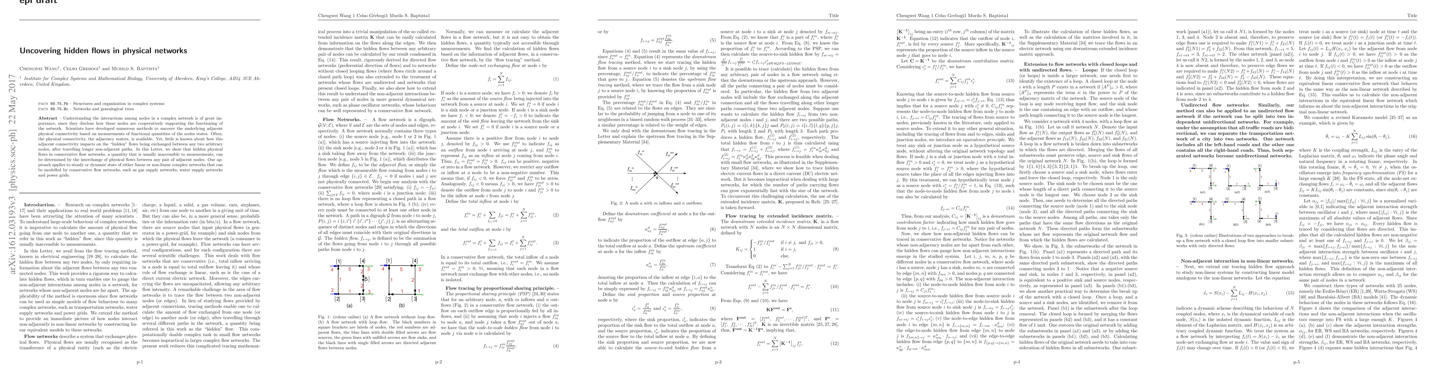 Understanding the interactions among nodes in a complex network is of great importance, since they disclose how these nodes are cooperatively supporting the functioning of the network. Scientists have developed numerous methods to uncover the underlying adjacent physical connectivity based on measurements of functional quantities of the nodes states. Often, the physical connectivity, the adjacency matrix, is available. Yet, little is known about how this adjacent connectivity impacts on the "hidden" flows being exchanged between any two arbitrary nodes, after travelling longer non-adjacent paths. In this Letter, we show that hidden physical flows in conservative flow networks, a quantity that is usually inaccessible to measurements, can be determined by the interchange of physical flows between any pair of adjacent nodes. Our approach applies to steady or dynamic state of either linear or non-linear complex networks that can be modelled by conservative flow networks, such as gas supply networks, water supply networks and power grids.