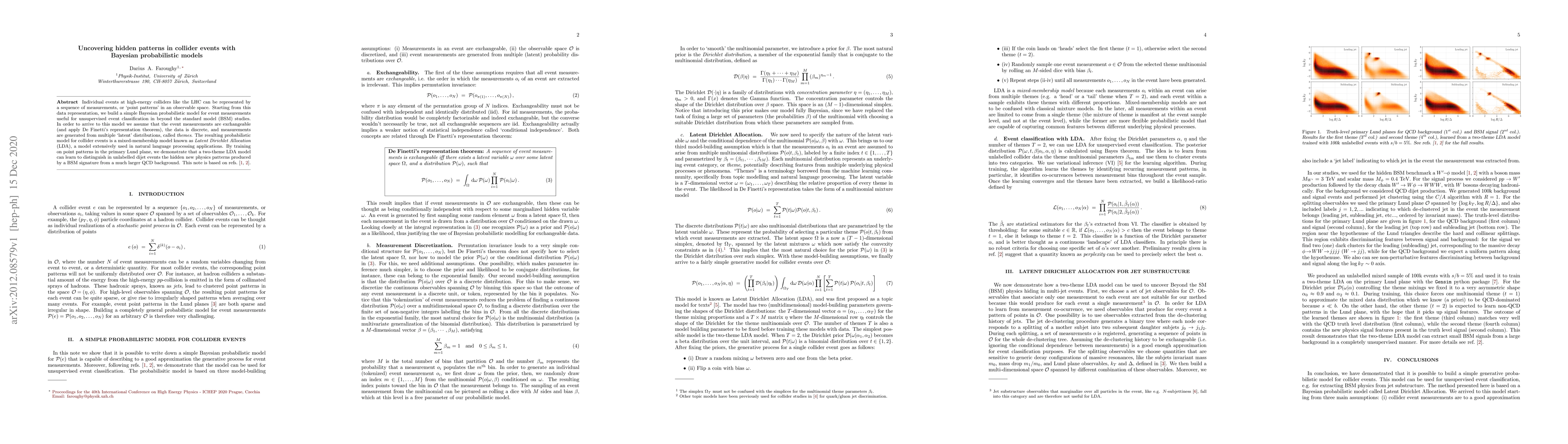 Individual events at high-energy colliders like the LHC can be represented by a sequence of measurements, or 'point patterns' in an observable space. Starting from this data representation, we build a simple Bayesian probabilistic model for event measurements useful for unsupervised event classification in beyond the standard model (BSM) studies. In order to arrive to this model we assume that the event measurements are exchangeable (and apply De Finetti's representation theorem), the data is discrete, and measurements are generated from multiple 'latent' distributions, called 'themes'. The resulting probabilistic model for collider events is a mixed-membership model known as Latent Dirichlet Allocation (LDA), a model extensively used in natural language processing applications. By training on point patterns in the primary Lund plane, we demonstrate that a two-theme LDA model can learn to distinguish in unlabelled dijet events the hidden new physics patterns produced by a BSM signature from a much larger QCD background. Based on 1904.04200 and 2005.12319.