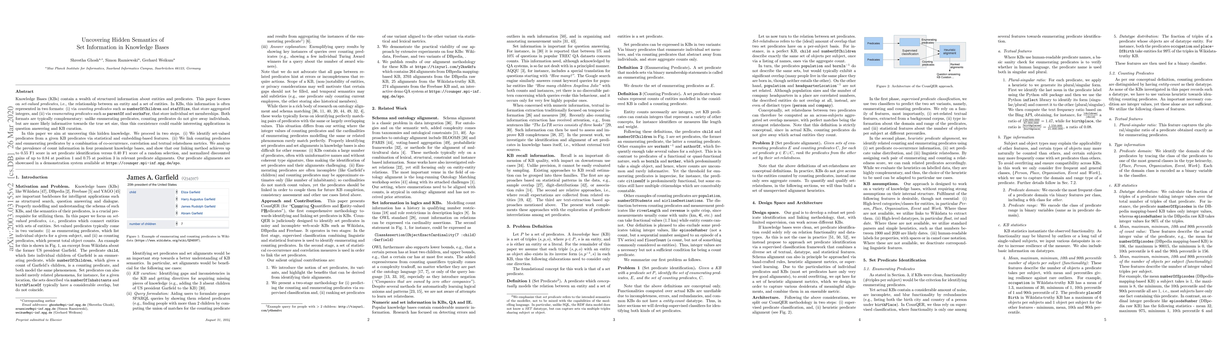Knowledge Bases (KBs) contain a wealth of structured information about entities and predicates. This paper focuses on set-valued predicates, i.e., the relationship between an entity and a set of entities. In KBs, this information is often represented in two formats: (i) via counting predicates such as numberOfChildren and staffSize, that store aggregated integers, and (ii) via enumerating predicates such as parentOf and worksFor, that store individual set memberships. Both formats are typically complementary: unlike enumerating predicates, counting predicates do not give away individuals, but are more likely informative towards the true set size, thus this coexistence could enable interesting applications in question answering and KB curation. In this paper we aim at uncovering this hidden knowledge. We proceed in two steps. (i) We identify set-valued predicates from a given KB predicates via statistical and embedding-based features. (ii) We link counting predicates and enumerating predicates by a combination of co-occurrence, correlation and textual relatedness metrics. We analyze the prevalence of count information in four prominent knowledge bases, and show that our linking method achieves up to 0.55 F1 score in set predicate identification versus 0.40 F1 score of a random selection, and normalized discounted gains of up to 0.84 at position 1 and 0.75 at position 3 in relevant predicate alignments. Our predicate alignments are showcased in a demonstration system available at https://counqer.mpi-inf.mpg.de/spo.