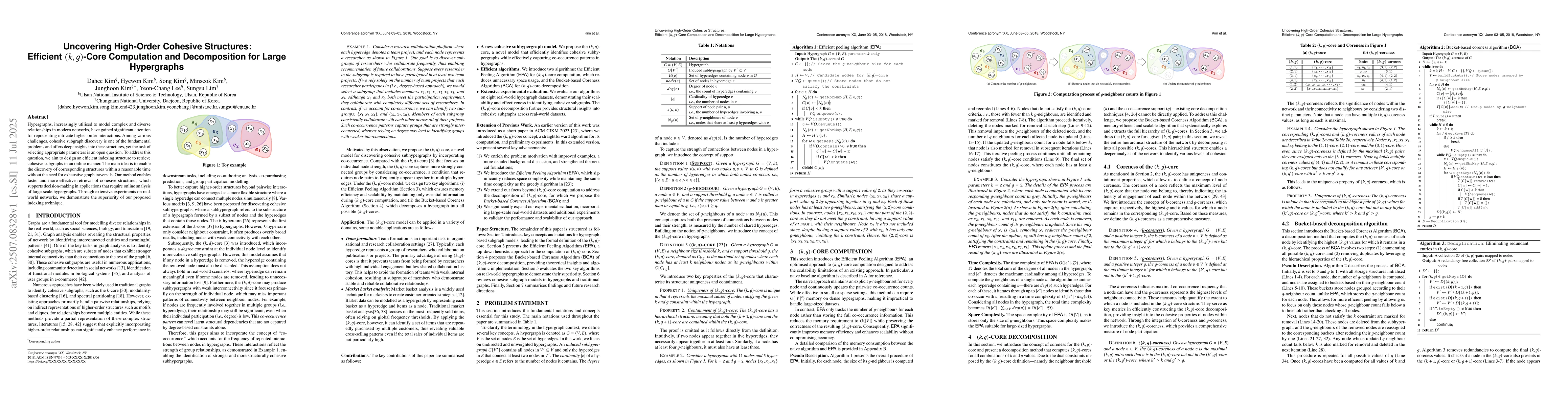 The paper presents the (k,g)-core model, EPA, and BCA, providing a novel approach to cohesive subgraph discovery in hypergraphs.