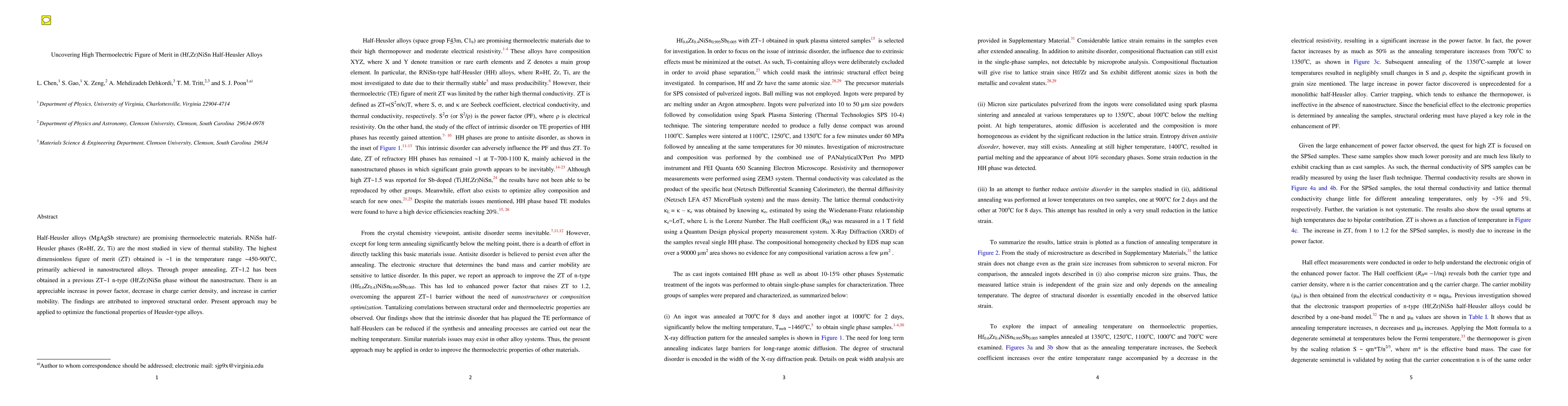 This paper investigates the thermoelectric properties of (Hf,Zr)NiSn half-Heusler alloys, achieving a high figure of merit (ZT~1.2) through annealing without nanostructuring. The improvement is due to increased structural order, leading to a higher power factor and better carrier mobility.