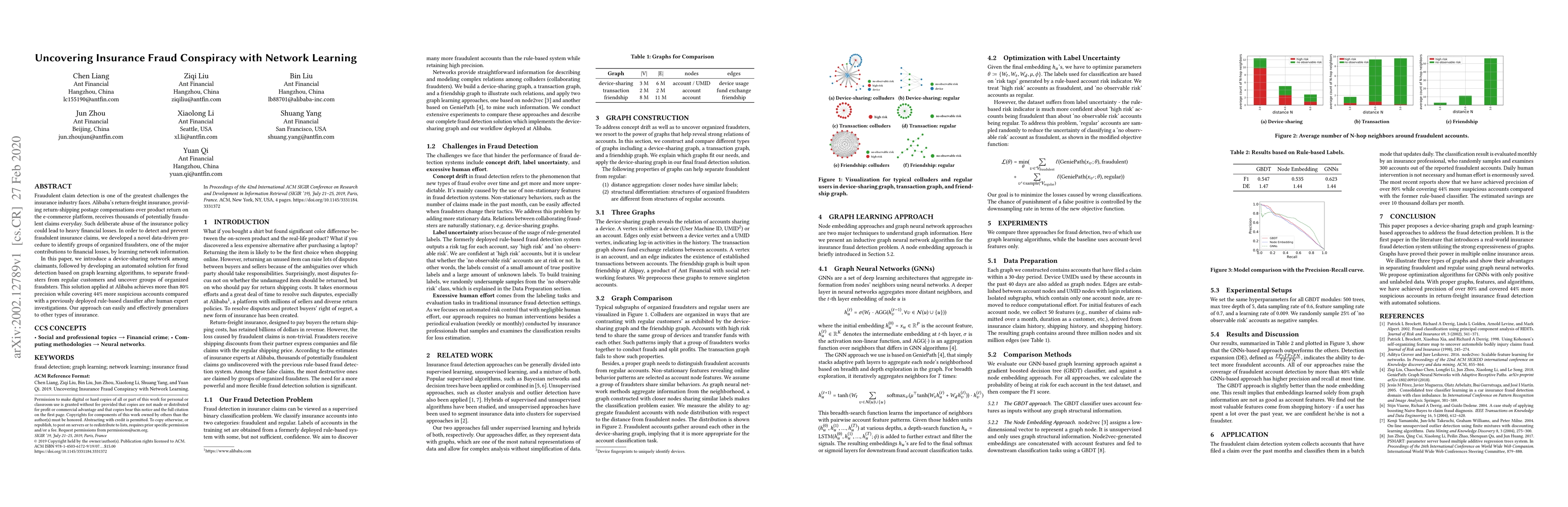 Fraudulent claim detection is one of the greatest challenges the insurance industry faces. Alibaba's return-freight insurance, providing return-shipping postage compensations over product return on the e-commerce platform, receives thousands of potentially fraudulent claims every day. Such deliberate abuse of the insurance policy could lead to heavy financial losses. In order to detect and prevent fraudulent insurance claims, we developed a novel data-driven procedure to identify groups of organized fraudsters, one of the major contributions to financial losses, by learning network information. In this paper, we introduce a device-sharing network among claimants, followed by developing an automated solution for fraud detection based on graph learning algorithms, to separate fraudsters from regular customers and uncover groups of organized fraudsters. This solution applied at Alibaba achieves more than 80% precision while covering 44% more suspicious accounts compared with a previously deployed rule-based classifier after human expert investigations. Our approach can easily and effectively generalizes to other types of insurance.