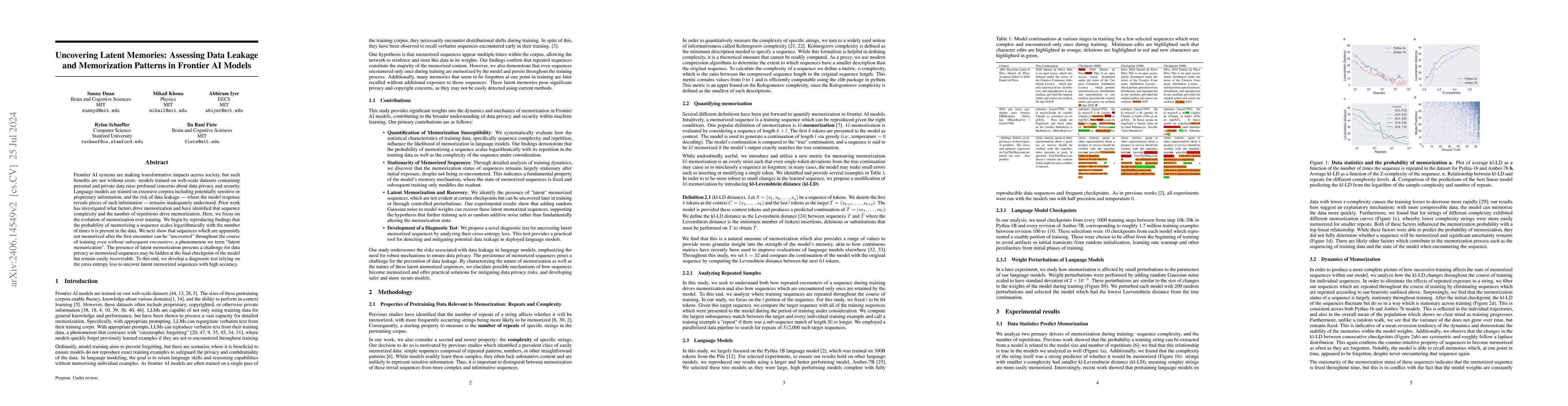 The proliferation of large language models has revolutionized natural language processing tasks, yet it raises profound concerns regarding data privacy and security. Language models are trained on extensive corpora including potentially sensitive or proprietary information, and the risk of data leakage -- where the model response reveals pieces of such information -- remains inadequately understood. This study examines susceptibility to data leakage by quantifying the phenomenon of memorization in machine learning models, focusing on the evolution of memorization patterns over training. We investigate how the statistical characteristics of training data influence the memories encoded within the model by evaluating how repetition influences memorization. We reproduce findings that the probability of memorizing a sequence scales logarithmically with the number of times it is present in the data. Furthermore, we find that sequences which are not apparently memorized after the first encounter can be uncovered throughout the course of training even without subsequent encounters. The presence of these latent memorized sequences presents a challenge for data privacy since they may be hidden at the final checkpoint of the model. To this end, we develop a diagnostic test for uncovering these latent memorized sequences by considering their cross entropy loss.