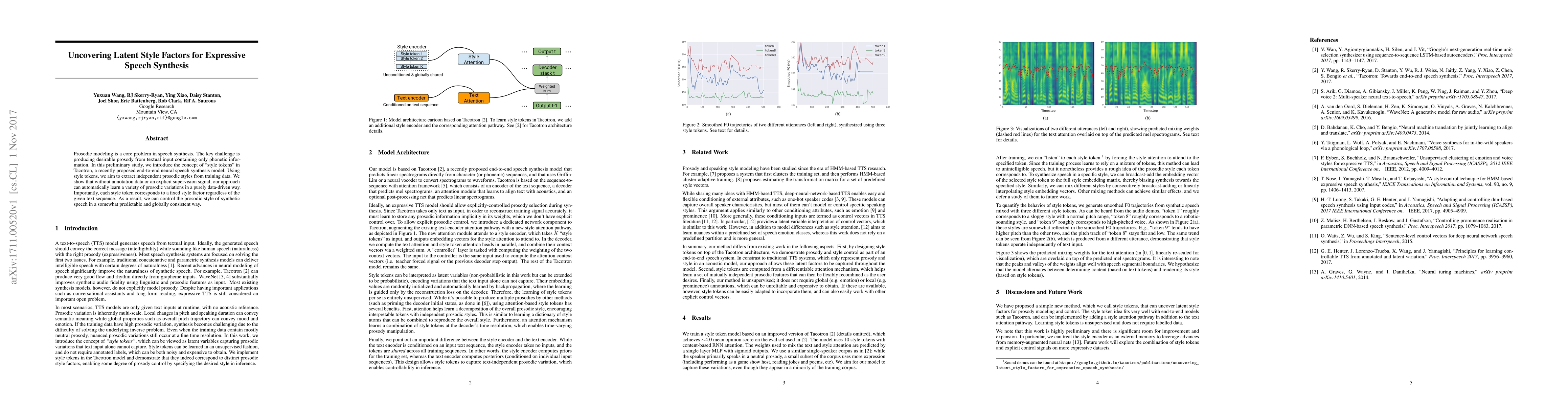 Prosodic modeling is a core problem in speech synthesis. The key challenge is producing desirable prosody from textual input containing only phonetic information. In this preliminary study, we introduce the concept of "style tokens" in Tacotron, a recently proposed end-to-end neural speech synthesis model. Using style tokens, we aim to extract independent prosodic styles from training data. We show that without annotation data or an explicit supervision signal, our approach can automatically learn a variety of prosodic variations in a purely data-driven way. Importantly, each style token corresponds to a fixed style factor regardless of the given text sequence. As a result, we can control the prosodic style of synthetic speech in a somewhat predictable and globally consistent way.