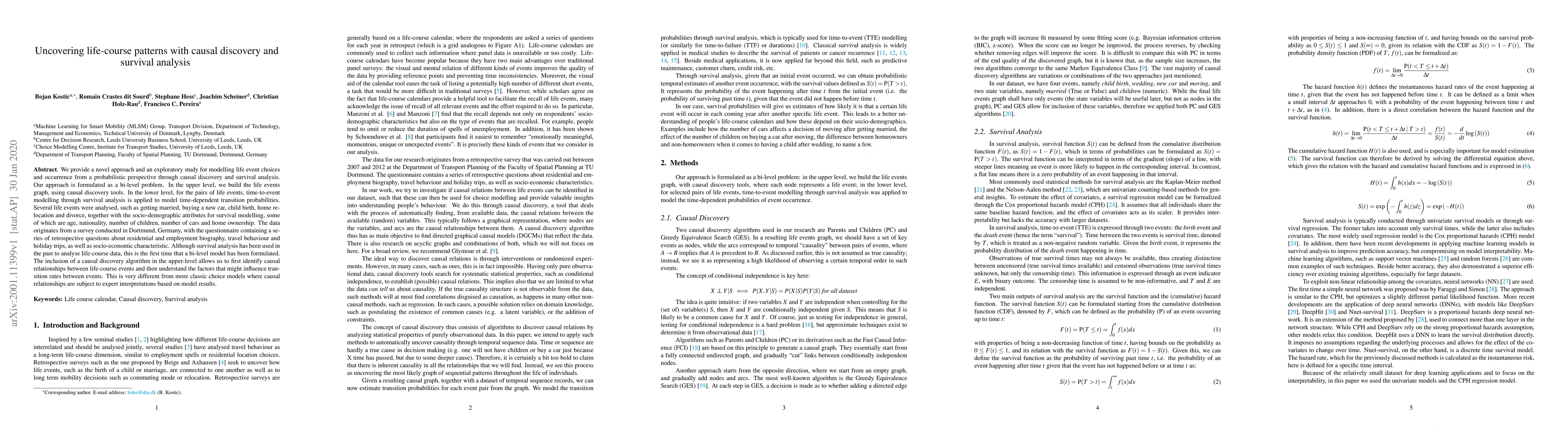 This study uses causal discovery and survival analysis to model life event choices and occurrences, identifying causal relationships between events and factors influencing transition rates. It provides a novel bi-level approach to understanding life-course patterns and offers a more data-driven alternative to traditional expert interpretations.