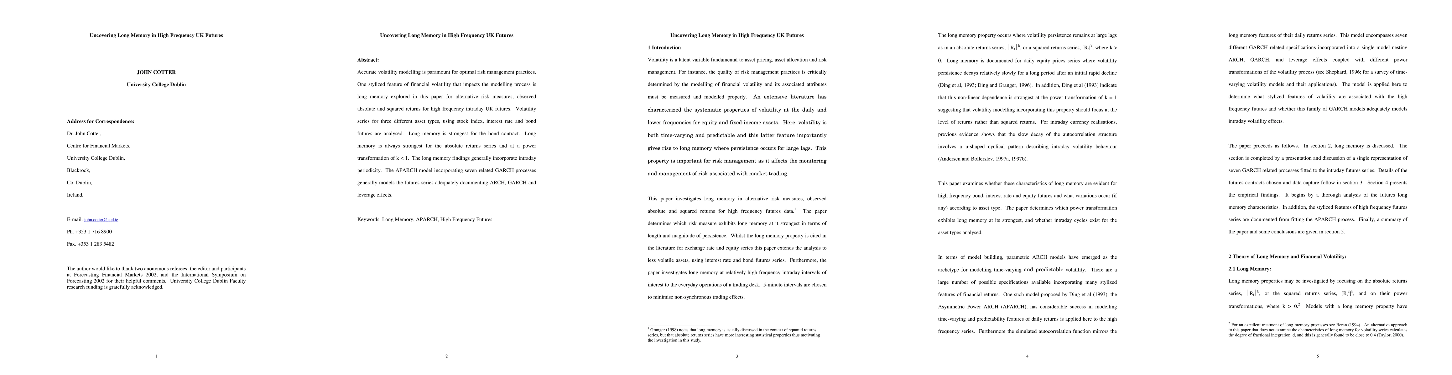 This study analyzes UK futures data to identify long memory in volatility, finding it strongest for bond contracts and absolute returns series. It suggests using the APARCH model to adequately capture ARCH, GARCH, and leverage effects in intraday futures pricing.