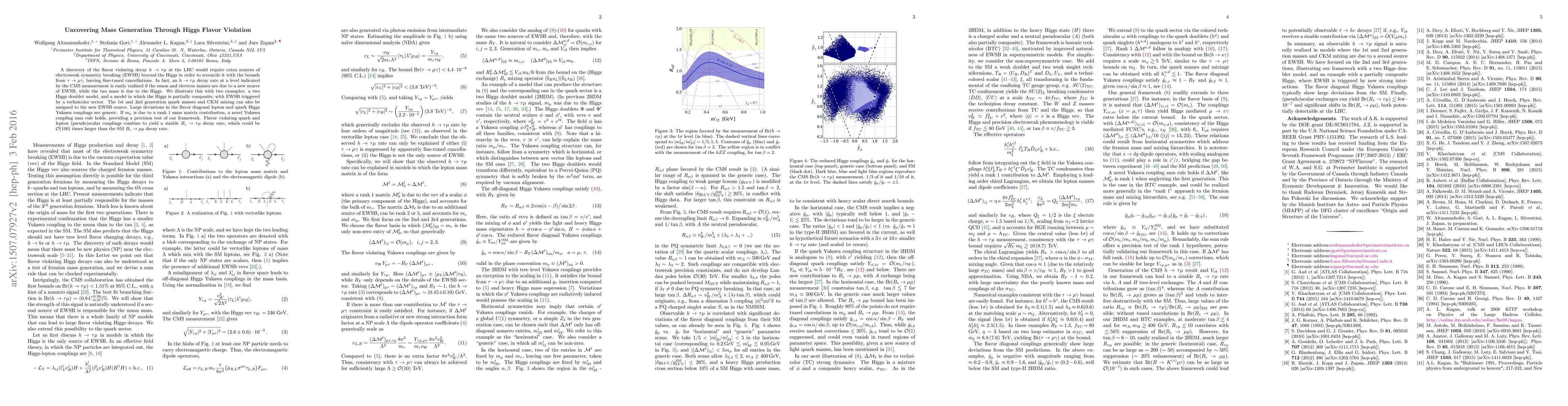 A discovery of the flavor violating decay h --> tau mu at the LHC would require extra sources of electroweak symmetry breaking (EWSB) beyond the Higgs in order to reconcile it with the bounds from tau --> mu gamma, barring fine-tuned cancellations. In fact, an h --> tau mu decay rate at a level indicated by the CMS measurement is easily realized if the muon and electron masses are due to a new source of EWSB, while the tau mass is due to the Higgs. We illustrate this with two examples: a two Higgs doublet model, and a model in which the Higgs is partially composite, with EWSB triggered by a technicolor sector. The 1st and 2nd generation quark masses and CKM mixing can also be assigned to the new EWSB source. Large deviations in the flavor diagonal lepton and quark Higgs Yukawa couplings are generic. If the muon mass is due to a rank 1 mass matrix contribution, a novel Yukawa coupling sum rule holds, providing a precision test of our framework. Flavor violating quark and lepton (pseudo)scalar couplings combine to yield a sizable B_s --> tau mu decay rate, which could be O(100) times larger than the SM B_s --> mu mu decay rate.