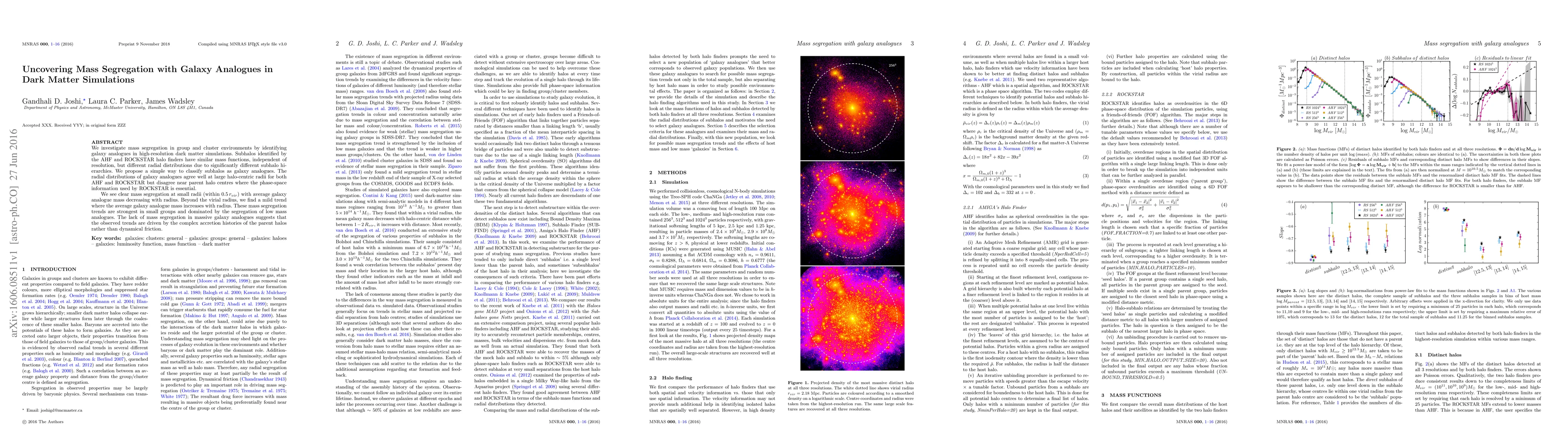 We investigate mass segregation in group and cluster environments by identifying galaxy analogues in high-resolution dark matter simulations. Subhalos identified by the AHF and ROCKSTAR halo finders have similar mass functions, independent of resolution, but different radial distributions due to significantly different subhalo hierarchies. We propose a simple way to classify subhalos as galaxy analogues. The radial distributions of galaxy analogues agree well at large halo-centric radii for both AHF and ROCKSTAR but disagree near parent halo centres where the phase-space information used by ROCKSTAR is essential. We see clear mass segregation at small radii (within $0.5\,r_{vir}$) with average galaxy analogue mass decreasing with radius. Beyond the virial radius, we find a mild trend where the average galaxy analogue mass increases with radius. These mass segregation trends are strongest in small groups and dominated by the segregation of low mass analogues. The lack of mass segregation in massive galaxy analogues suggests that the observed trends are driven by the complex accretion histories of the parent halos rather than dynamical friction.