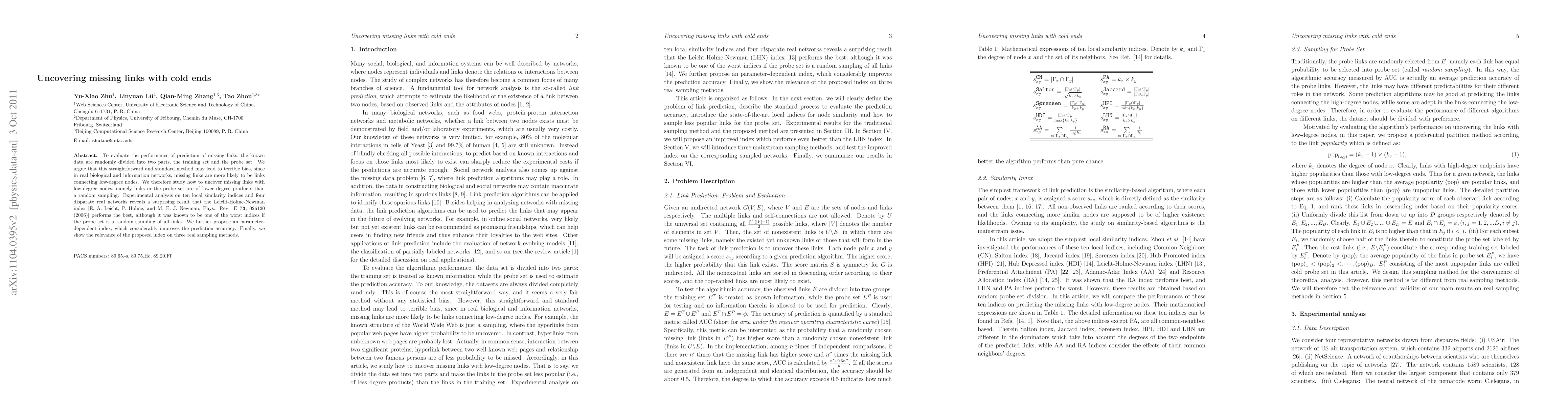 This paper evaluates prediction methods for uncovering missing links in networks, particularly focusing on links between low-degree nodes. It finds that the Leicht-Holme-Newman index outperforms others in this context and proposes a parameter-dependent index to further improve prediction accuracy.