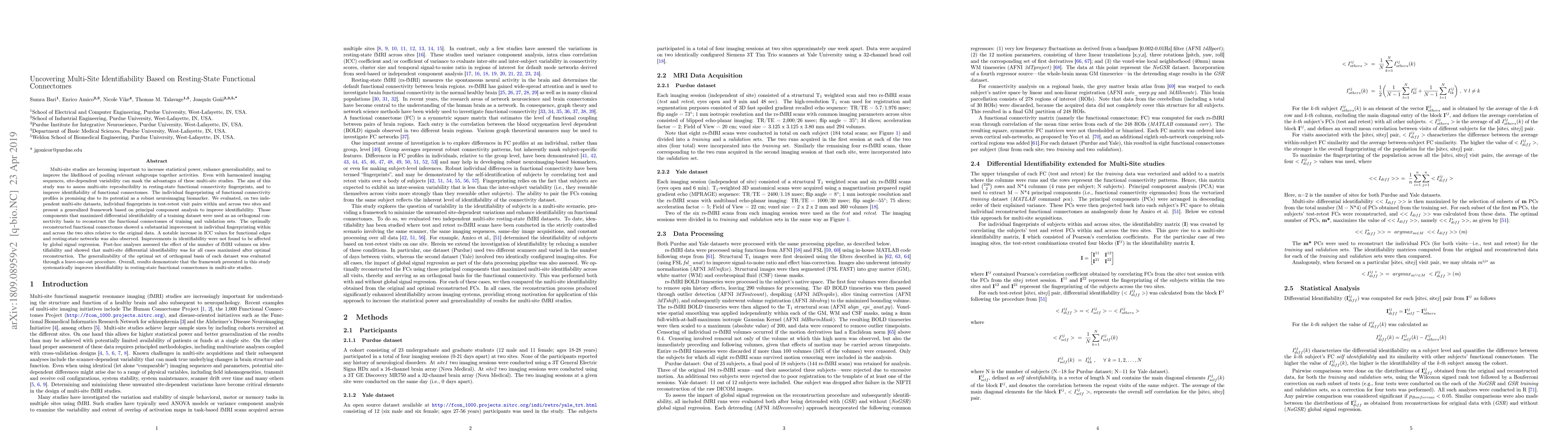 This study assesses multi-site reproducibility in resting-state functional connectivity fingerprints and proposes a generalized framework based on principal component analysis to enhance identifiability. The framework significantly improved individual fingerprinting and generalizability across two sites, demonstrating substantial improvements in ICC values and optimal reconstruction of functional connectomes.