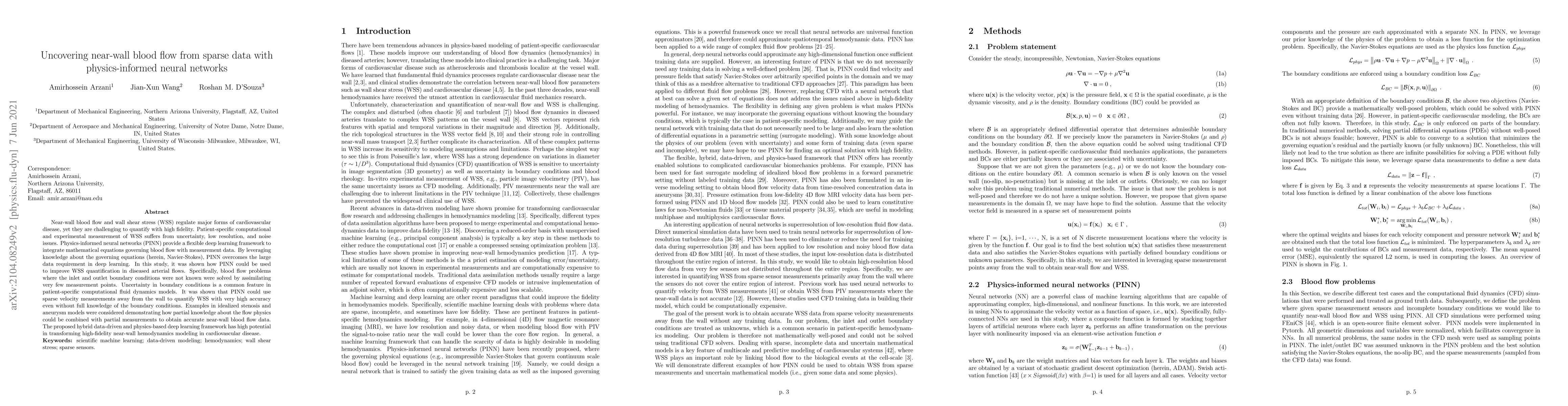 This paper explores the use of physics-informed neural networks (PINN) to accurately quantify near-wall blood flow and wall shear stress (WSS) from sparse data, addressing the challenges of uncertainty, low resolution, and noise in patient-specific measurements. PINN integrates the Navier-Stokes equations with limited measurement points to achieve high-fidelity WSS quantification in diseased arterial flows, demonstrating its potential to transform hemodynamics modeling in cardiovascular disease.