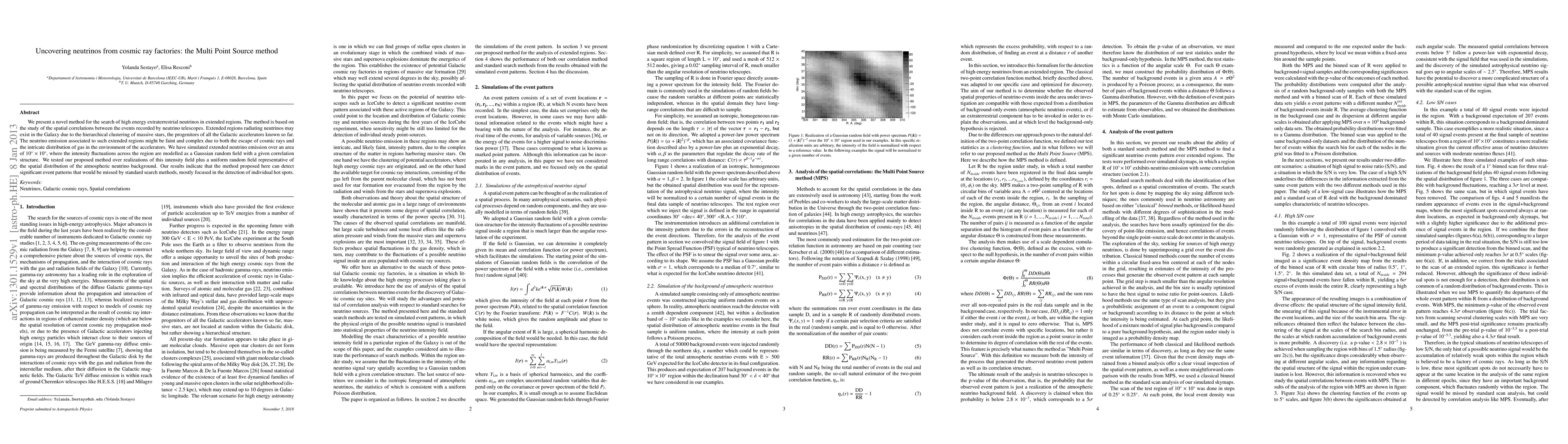 We present a novel method for the search of high energy extraterrestrial neutrinos in extended regions. The method is based on the study of the spatial correlations between the events recorded by neutrino telescopes. Extended regions radiating neutrinos may exist in the Galaxy due to the hierarchical clustering of massive stars, the progenitors of all the Galactic accelerators known so far. The neutrino emission associated to such extended regions might be faint and complex due to both the escape of cosmic rays and the intricate distribution of gas in the environment of the accelerators. We have simulated extended neutrino emission over an area of 10deg x 10deg, where the intensity fluctuations across the region are modelled as a Gaussian random field with a given correlation structure. We tested our proposed method over realizations of this intensity field plus a uniform random field representative of the spatial distribution of the atmospheric neutrino background. Our results indicate that the method proposed here can detect significant event patterns that would be missed by standard search methods, mostly focused in the detection of individual hot spots.