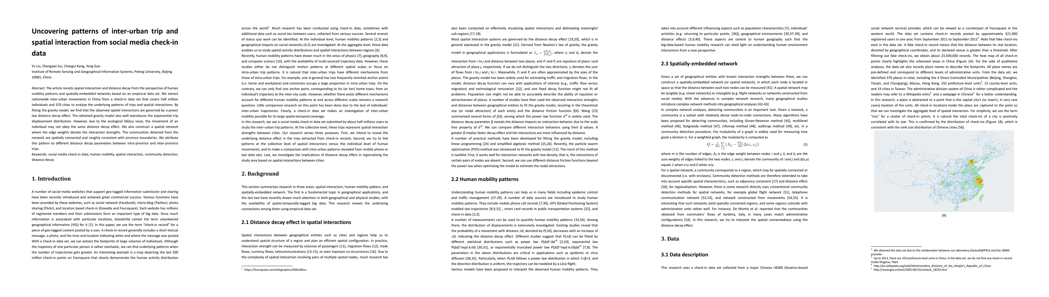 This study uses social media check-in data to analyze inter-urban trip patterns in China, finding power law distance decay effects and spatially connected communities that mirror provincial boundaries.