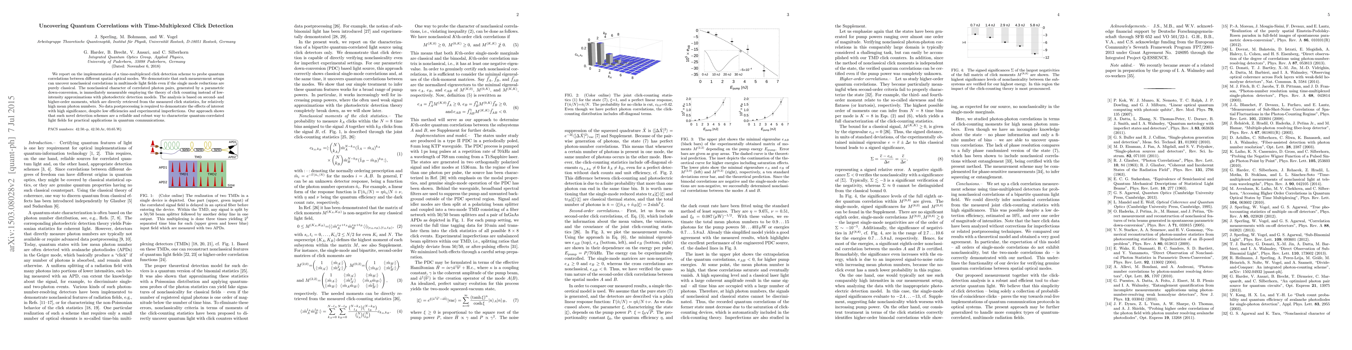 We report on the implementation of a time-multiplexed click detection scheme to probe quantum correlations between different spatial optical modes. We demonstrate that such measurement setups can uncover nonclassical correlations in multimode light fields even if the single mode reductions are purely classical. The nonclassical character of correlated photon pairs, generated by a parametric down-conversion, is immediately measurable employing the theory of click counting instead of low-intensity approximations with photoelectric detection models. The analysis is based on second- and higher-order moments, which are directly retrieved from the measured click statistics, for relatively high mean photon numbers. No data postprocessing is required to demonstrate the effects of interest with high significance, despite low efficiencies and experimental imperfections. Our approach shows that such novel detection schemes are a reliable and robust way to characterize quantum-correlated light fields for practical applications in quantum communications.