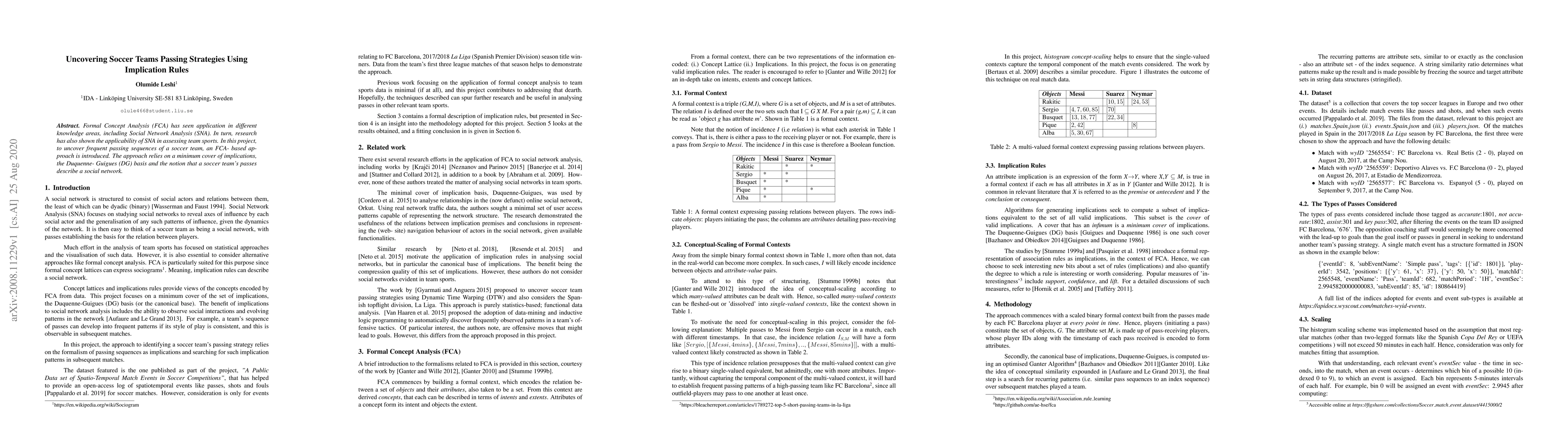 Formal Concept Analysis FCA has seen application in different knowledge areas, including Social Network Analysis SNA. In turn, research has also shown the applicability of SNA in assessing team sports. In this project, to uncover frequent passing sequences of a soccer team, an FCA based approach is introduced. The approach relies on a minimum cover of implications, the Duquenne Guigues DG basis and the notion that a soccer teams passes describe a social network.
