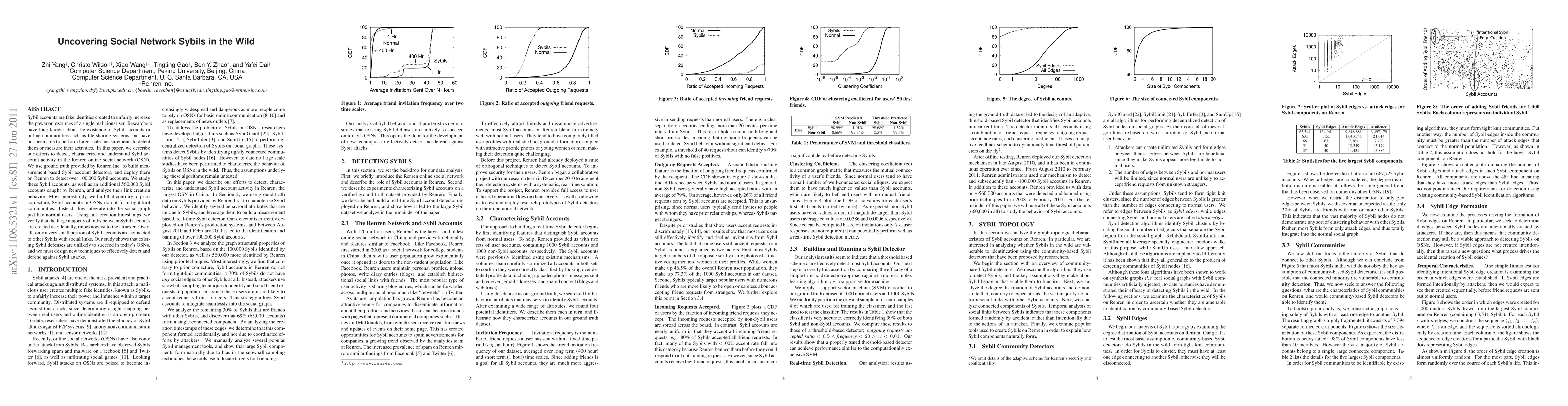 Sybil accounts are fake identities created to unfairly increase the power or resources of a single malicious user. Researchers have long known about the existence of Sybil accounts in online communities such as file-sharing systems, but have not been able to perform large scale measurements to detect them or measure their activities. In this paper, we describe our efforts to detect, characterize and understand Sybil account activity in the Renren online social network (OSN). We use ground truth provided by Renren Inc. to build measurement based Sybil account detectors, and deploy them on Renren to detect over 100,000 Sybil accounts. We study these Sybil accounts, as well as an additional 560,000 Sybil accounts caught by Renren, and analyze their link creation behavior. Most interestingly, we find that contrary to prior conjecture, Sybil accounts in OSNs do not form tight-knit communities. Instead, they integrate into the social graph just like normal users. Using link creation timestamps, we verify that the large majority of links between Sybil accounts are created accidentally, unbeknownst to the attacker. Overall, only a very small portion of Sybil accounts are connected to other Sybils with social links. Our study shows that existing Sybil defenses are unlikely to succeed in today's OSNs, and we must design new techniques to effectively detect and defend against Sybil attacks.