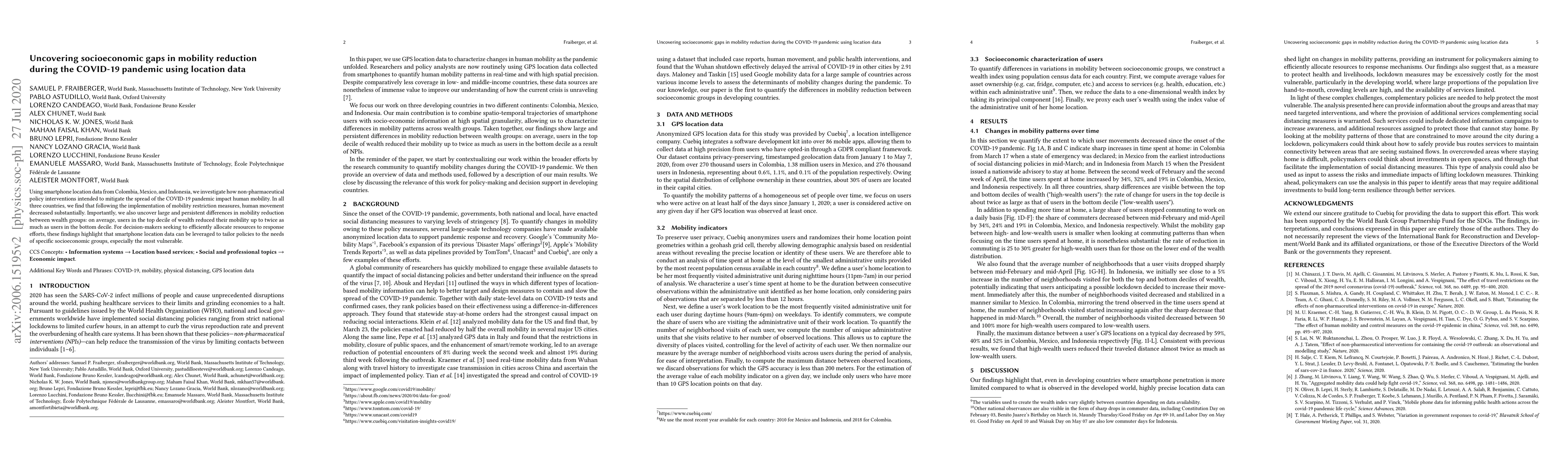 This study uses smartphone location data from Colombia, Mexico, and Indonesia to reveal significant socioeconomic disparities in mobility reduction during the COVID-19 pandemic. Wealthier individuals reduced their mobility more than twice as much as poorer individuals, suggesting tailored policy approaches are needed to support vulnerable groups.
