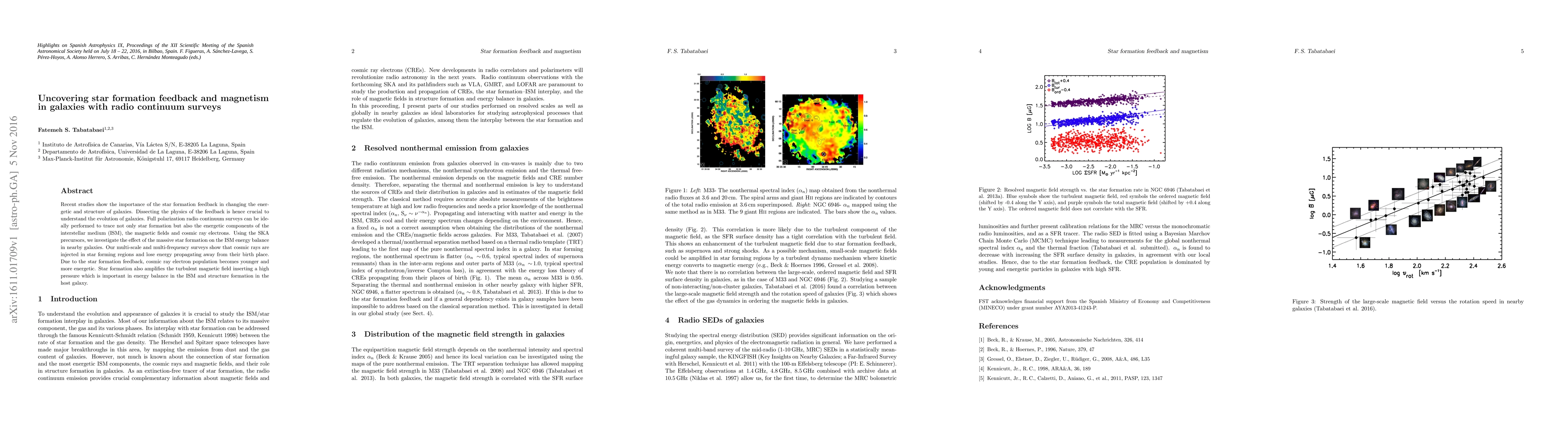 This paper investigates the impact of star formation feedback on the interstellar medium (ISM) energy balance in nearby galaxies using radio continuum surveys. It finds that cosmic rays are injected in star-forming regions, become younger and more energetic, and that star formation amplifies turbulent magnetic fields, contributing to ISM energy balance and galaxy structure formation.