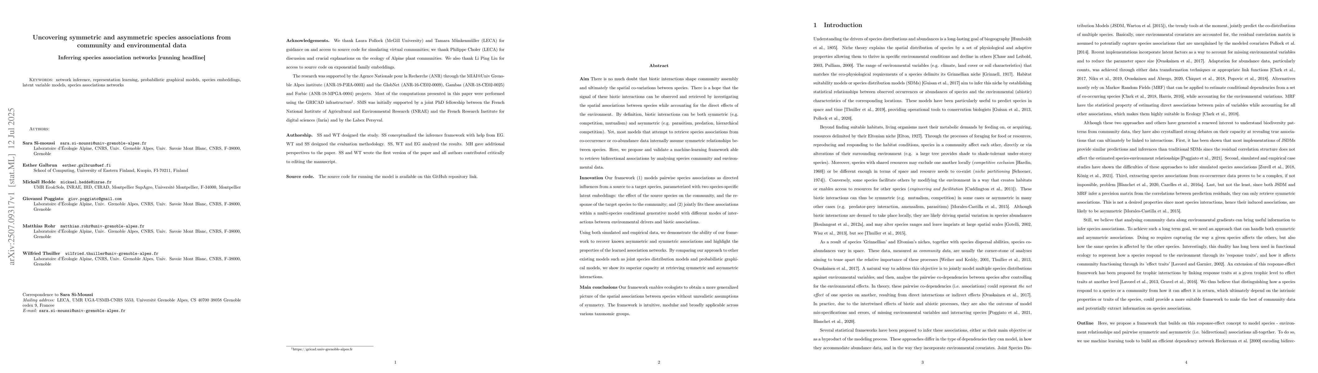 There is no much doubt that biotic interactions shape community assembly and ultimately the spatial co-variations between species. There is a hope that the signal of these biotic interactions can be observed and retrieved by investigating the spatial associations between species while accounting for the direct effects of the environment. By definition, biotic interactions can be both symmetric and asymmetric. Yet, most models that attempt to retrieve species associations from co-occurrence or co-abundance data internally assume symmetric relationships between species. Here, we propose and validate a machine-learning framework able to retrieve bidirectional associations by analyzing species community and environmental data. Our framework (1) models pairwise species associations as directed influences from a source to a target species, parameterized with two species-specific latent embeddings: the effect of the source species on the community, and the response of the target species to the community; and (2) jointly fits these associations within a multi-species conditional generative model with different modes of interactions between environmental drivers and biotic associations. Using both simulated and empirical data, we demonstrate the ability of our framework to recover known asymmetric and symmetric associations and highlight the properties of the learned association networks. By comparing our approach to other existing models such as joint species distribution models and probabilistic graphical models, we show its superior capacity at retrieving symmetric and asymmetric interactions. The framework is intuitive, modular and broadly applicable across various taxonomic groups.