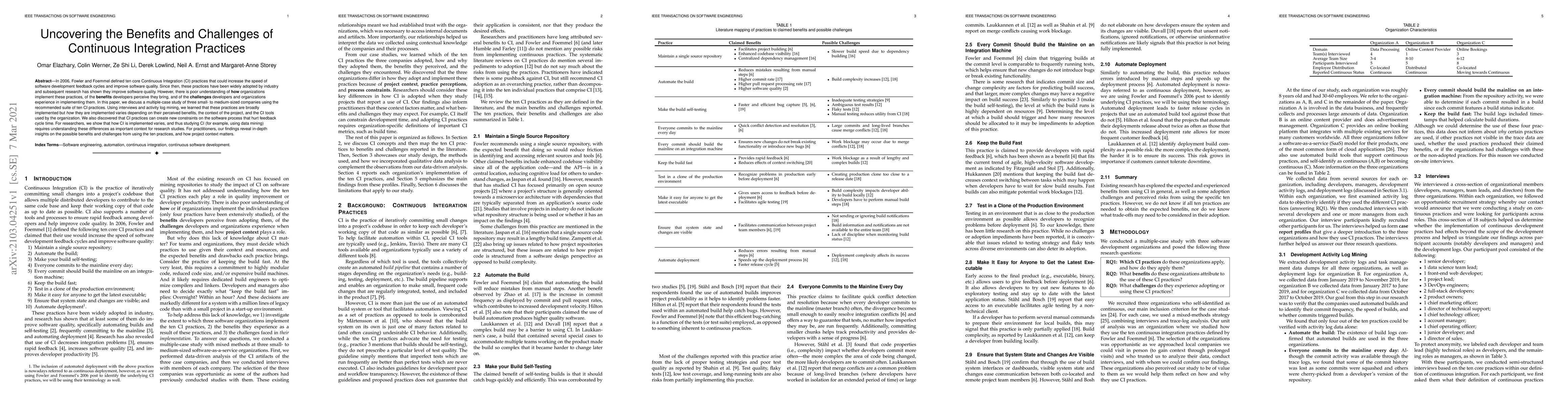 In 2006, Fowler and Foemmel defined ten core Continuous Integration (CI) practices that could increase the speed of software development feedback cycles and improve software quality. Since then, these practices have been widely adopted by industry and subsequent research has shown they improve software quality. However, there is poor understanding of how organizations implement these practices, of the benefits developers perceive they bring, and of the challenges developers and organizations experience in implementing them. In this paper, we discuss a multiple-case study of three small- to medium-sized companies using the recommended suite of ten CI practices. Using interviews and activity log mining, we learned that these practices are broadly implemented but how they are implemented varies depending on their perceived benefits, the context of the project, and the CI tools used by the organization. We also discovered that CI practices can create new constraints on the software process that hurt feedback cycle time. For researchers, we show that how CI is implemented varies, and thus studying CI (for example, using data mining) requires understanding these differences as important context for research studies. For practitioners, our findings reveal in-depth insights on the possible benefits and challenges from using the ten practices, and how project context matters.