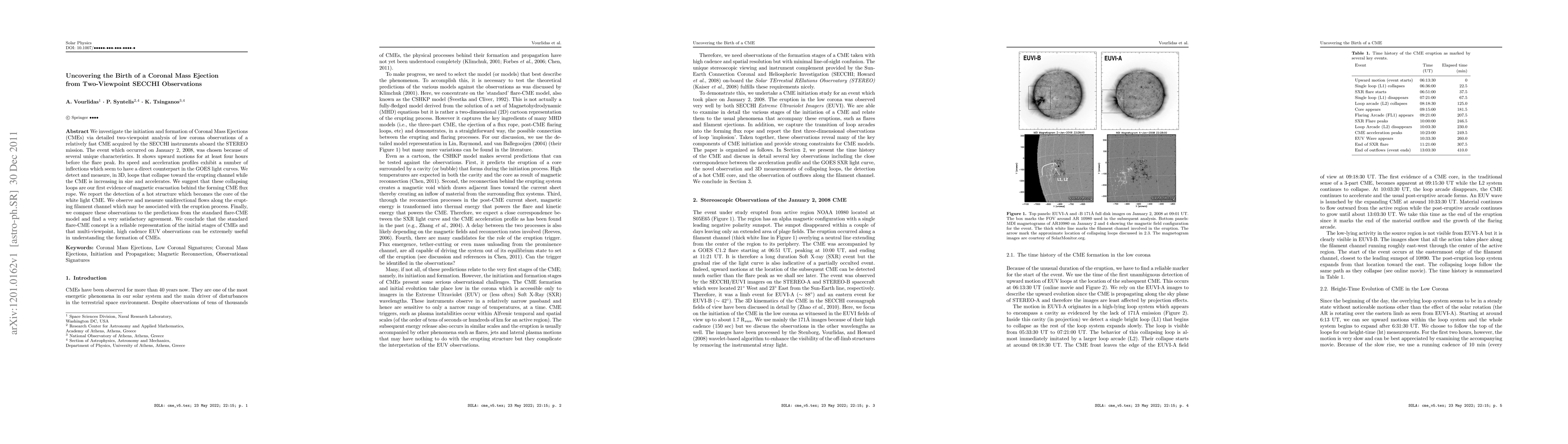 We investigate the initiation and formation of Coronal Mass Ejections (CMEs) via detailed two-viewpoint analysis of low corona observations of a relatively fast CME acquired by the SECCHI instruments aboard the STEREO mission. The event which occurred on January 2, 2008, was chosen because of several unique characteristics. It shows upward motions for at least four hours before the flare peak. Its speed and acceleration profiles exhibit a number of inflections which seem to have a direct counterpart in the GOES light curves. We detect and measure, in 3D, loops that collapse toward the erupting channel while the CME is increasing in size and accelerates. We suggest that these collapsing loops are our first evidence of magnetic evacuation behind the forming CME flux rope. We report the detection of a hot structure which becomes the core of the white light CME. We observe and measure unidirectional flows along the erupting filament channel which may be associated with the eruption process. Finally, we compare these observations to the predictions from the standard flare-CME model and find a very satisfactory agreement. We conclude that the standard flare-CME concept is a reliable representation of the initial stages of CMEs and that multi-viewpoint, high cadence EUV observations can be extremely useful in understanding the formation of CMEs.