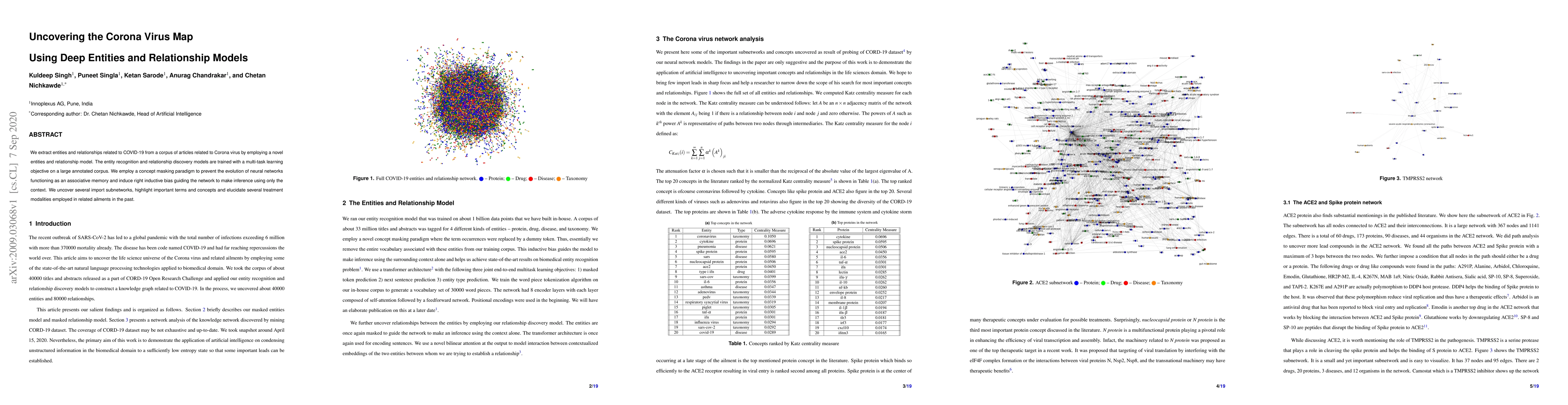 We extract entities and relationships related to COVID-19 from a corpus of articles related to Corona virus by employing a novel entities and relationship model. The entity recognition and relationship discovery models are trained with a multi-task learning objective on a large annotated corpus. We employ a concept masking paradigm to prevent the evolution of neural networks functioning as an associative memory and induce right inductive bias guiding the network to make inference using only the context. We uncover several import subnetworks, highlight important terms and concepts and elucidate several treatment modalities employed in related ailments in the past.