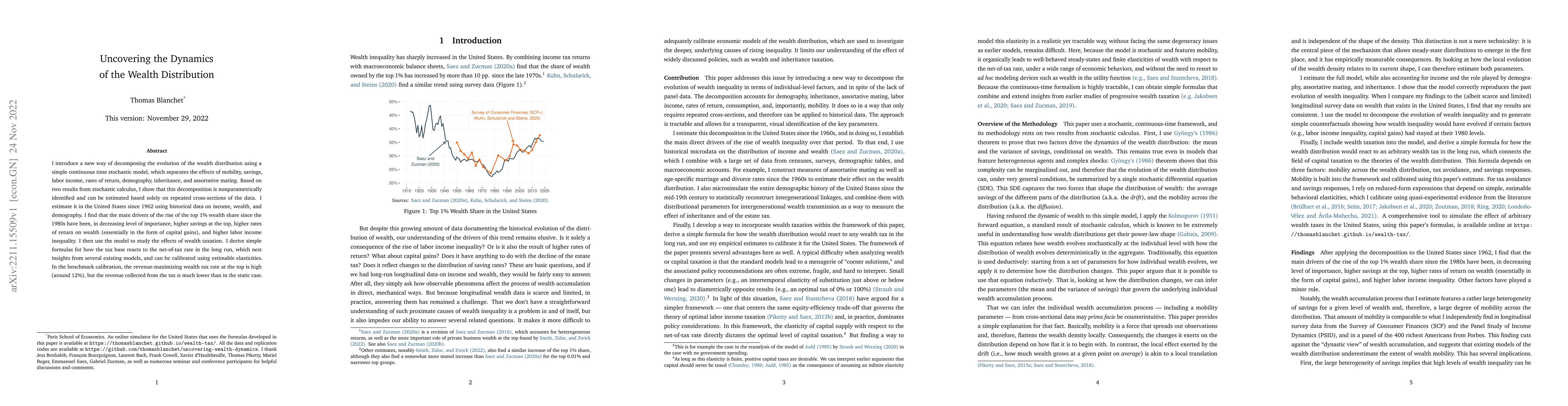 This paper develops a novel stochastic model to decompose the wealth distribution's evolution into factors like mobility, savings, and labor income inequality. It finds that since the 1980s, the top 1% wealth share rise in the U.S. is primarily driven by higher top savings, capital gains, and labor income inequality, and proposes a wealth tax model with a revenue-maximizing rate of around 12%.