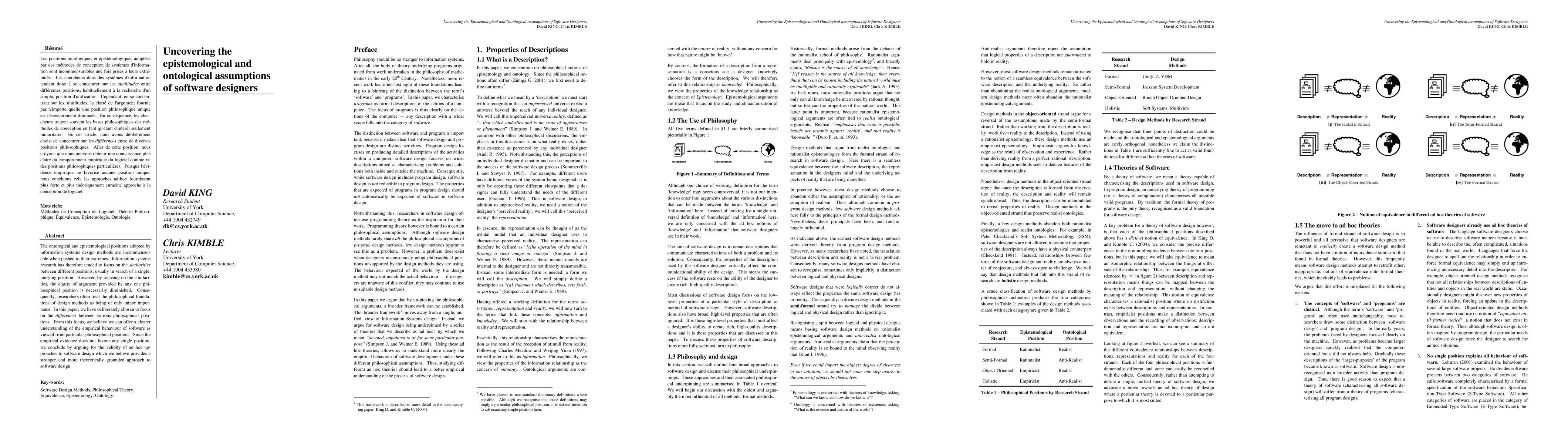 The ontological and epistemological positions adopted by information systems design methods are incommensur-able when pushed to their extremes. Information systems research has therefore tended to focus on the similarities between different positions, usually in search of a single, unifying position. However, by focusing on the similari-ties, the clarity of argument provided by any one philoso-phical position is necessarily diminished. Consequently, researchers often treat the philosophical foundations of design methods as being of only minor importance. In this paper, we have deliberately chosen to focus on the differences between various philosophical positions. From this focus, we believe we can offer a clearer under-standing of the empirical behaviour of software as viewed from particular philosophical positions. Since the em-pirical evidence does not favour any single position, we conclude by arguing for the validity of ad hoc approaches to software design which we believe provides a stronger and more theoretically grounded approach to software design.