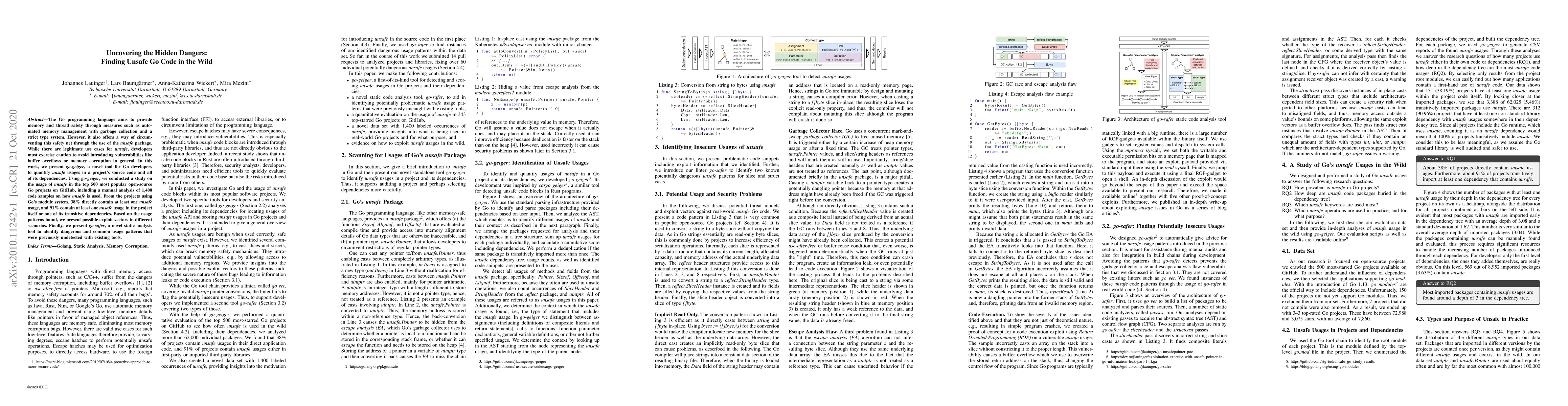 The Go programming language aims to provide memory and thread safety through measures such as automated memory management with garbage collection and a strict type system. However, it also offers a way of circumventing this safety net through the use of the unsafe package. While there are legitimate use cases for unsafe, developers must exercise caution to avoid introducing vulnerabilities like buffer overflows or memory corruption in general. Using go-geiger, we conducted a study on the usage of unsafe in the top 500 most popular open-source Go projects on GitHub, including a manual analysis of 1,400 code samples on how unsafe is used. From the projects using Go's module system, 38% directly contain at least one unsafe usage, and 91% contain at least one unsafe usage in the project itself or one of its transitive dependencies. Based on the usage patterns found, we present possible exploit vectors in different scenarios. Finally, we present go-safer, a novel static analysis tool to identify dangerous and common usage patterns that were previously undetected with existing tools.