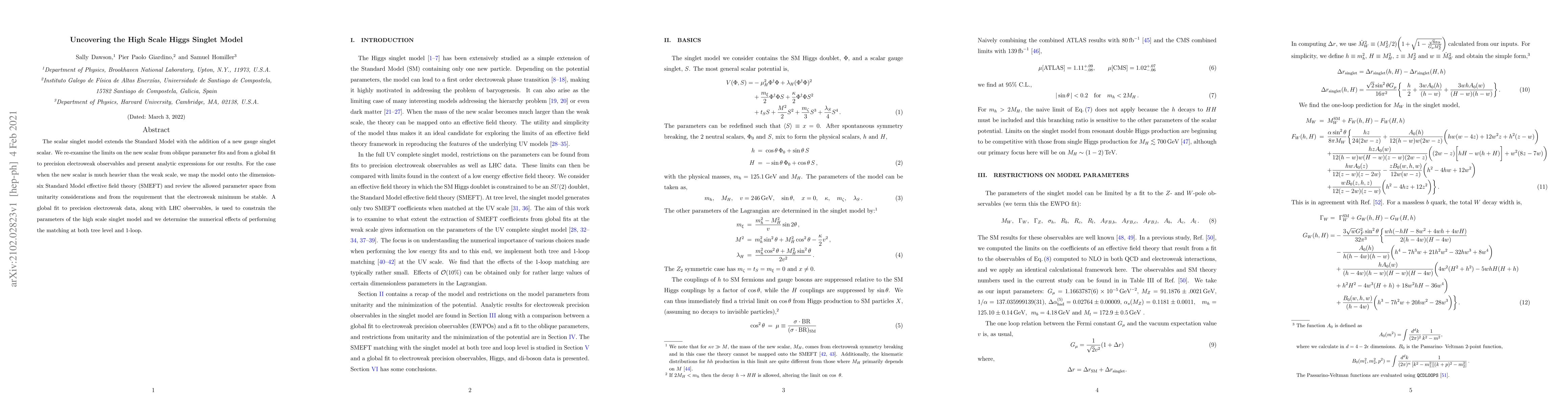 The scalar singlet model extends the Standard Model with the addition of a new gauge singlet scalar. We re-examine the limits on the new scalar from oblique parameter fits and from a global fit to precision electroweak observables and present analytic expressions for our results. For the case when the new scalar is much heavier than the weak scale, we map the model onto the dimension-six Standard Model effective field theory (SMEFT) and review the allowed parameter space from unitarity considerations and from the requirement that the electroweak minimum be stable. A global fit to precision electroweak data, along with LHC observables, is used to constrain the parameters of the high scale singlet model and we determine the numerical effects of performing the matching at both tree level and 1-loop.