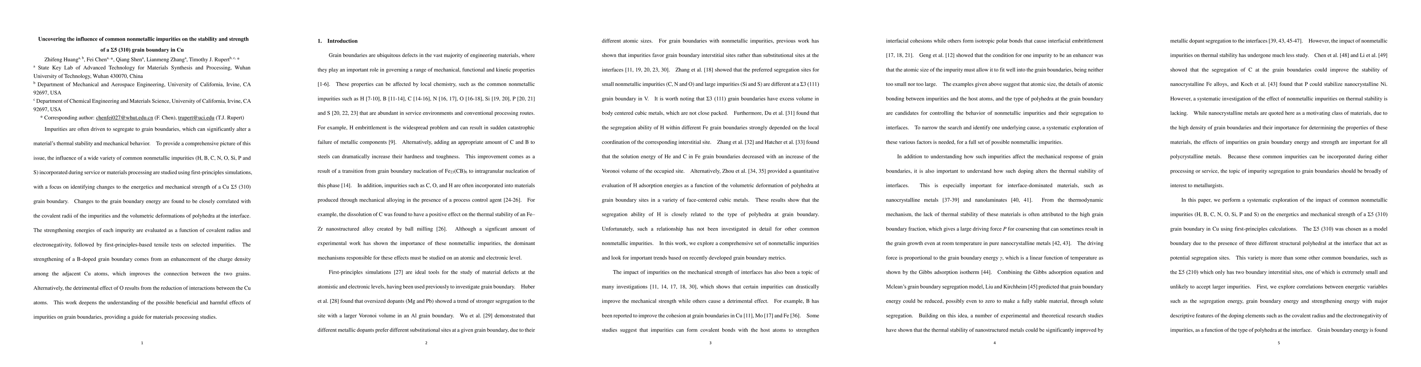 This study investigates the impact of common nonmetal impurities on the stability and strength of a Cu $\Sigma$5 (310) grain boundary using first-principles simulations. The research reveals that impurity effects on grain boundary energy and mechanical strength correlate with impurity covalent radii and interface deformations, highlighting beneficial enhancements from B doping and detrimental effects from O.
