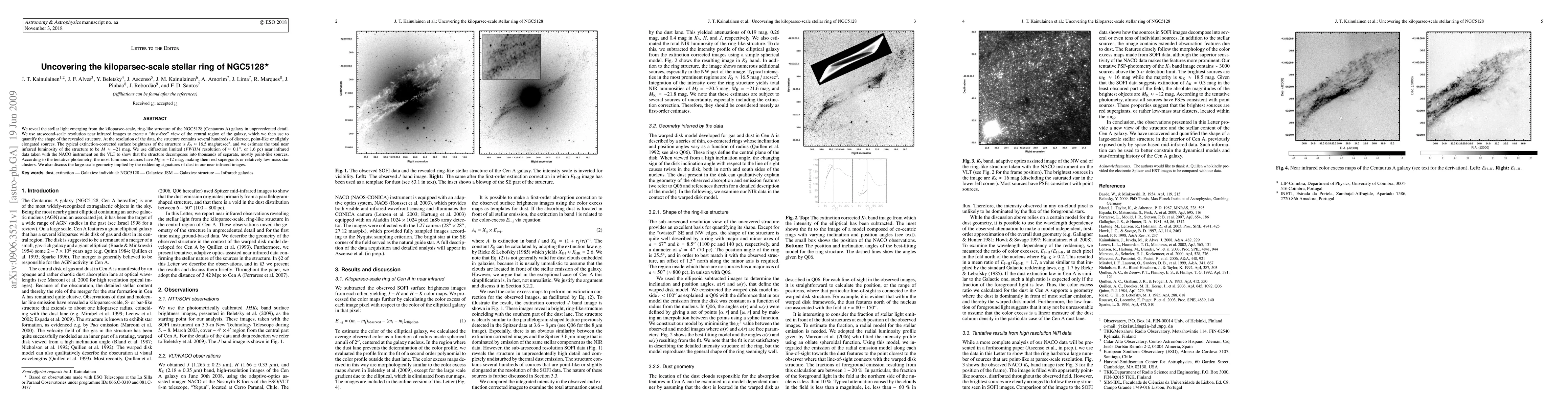 We reveal the stellar light emerging from the kiloparsec-scale, ring-like structure of the NGC5128 (Centaurus A) galaxy in unprecedented detail. We use arcsecond-scale resolution near infrared images to create a "dust-free" view of the central region of the galaxy, which we then use to quantify the shape of the revealed structure. At the resolution of the data, the structure contains several hundreds of discreet, point-like or slightly elongated sources. Typical extinction corrected surface brightness of the structure is K_S = 16.5 mag/arcsec^2, and we estimate the total near infrared luminosity of the structure to be M = -21 mag. We use diffraction limited (FWHM resolution of ~ 0.1", or 1.6 pc) near infrared data taken with the NACO instrument on VLT to show that the structure decomposes into thousands of separate, mostly point-like sources. According to the tentative photometry, the most luminous sources have M_K = -12 mag, naming them red supergiants or relatively low-mass star clusters. We also discuss the large-scale geometry implied by the reddening signatures of dust in our near infrared images.