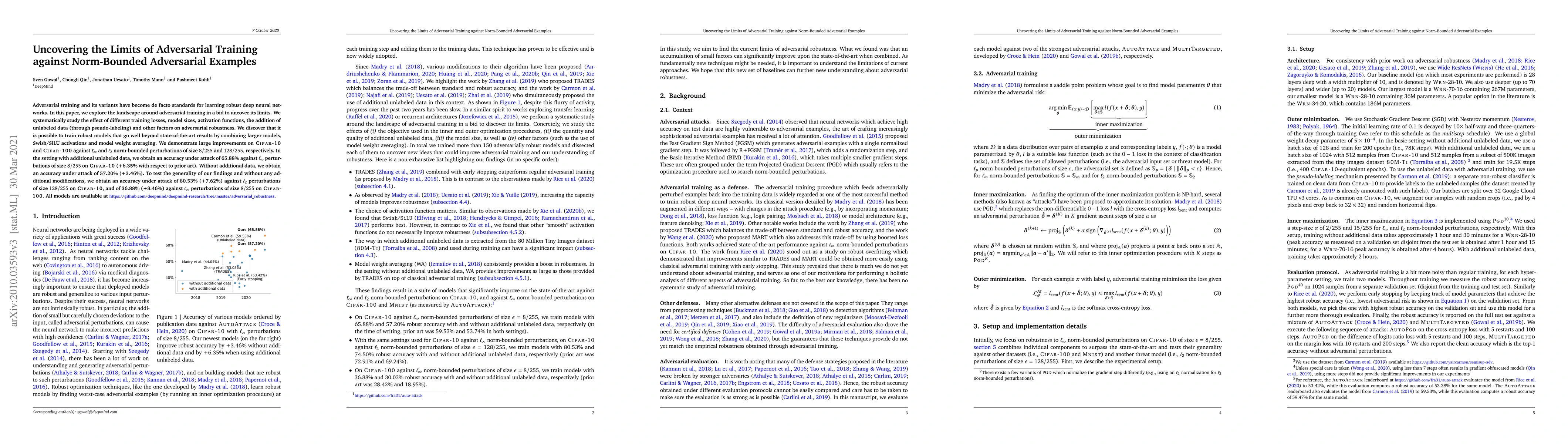 Adversarial training and its variants have become de facto standards for learning robust deep neural networks. In this paper, we explore the landscape around adversarial training in a bid to uncover its limits. We systematically study the effect of different training losses, model sizes, activation functions, the addition of unlabeled data (through pseudo-labeling) and other factors on adversarial robustness. We discover that it is possible to train robust models that go well beyond state-of-the-art results by combining larger models, Swish/SiLU activations and model weight averaging. We demonstrate large improvements on CIFAR-10 and CIFAR-100 against $\ell_\infty$ and $\ell_2$ norm-bounded perturbations of size $8/255$ and $128/255$, respectively. In the setting with additional unlabeled data, we obtain an accuracy under attack of 65.88% against $\ell_\infty$ perturbations of size $8/255$ on CIFAR-10 (+6.35% with respect to prior art). Without additional data, we obtain an accuracy under attack of 57.20% (+3.46%). To test the generality of our findings and without any additional modifications, we obtain an accuracy under attack of 80.53% (+7.62%) against $\ell_2$ perturbations of size $128/255$ on CIFAR-10, and of 36.88% (+8.46%) against $\ell_\infty$ perturbations of size $8/255$ on CIFAR-100. All models are available at https://github.com/deepmind/deepmind-research/tree/master/adversarial_robustness.